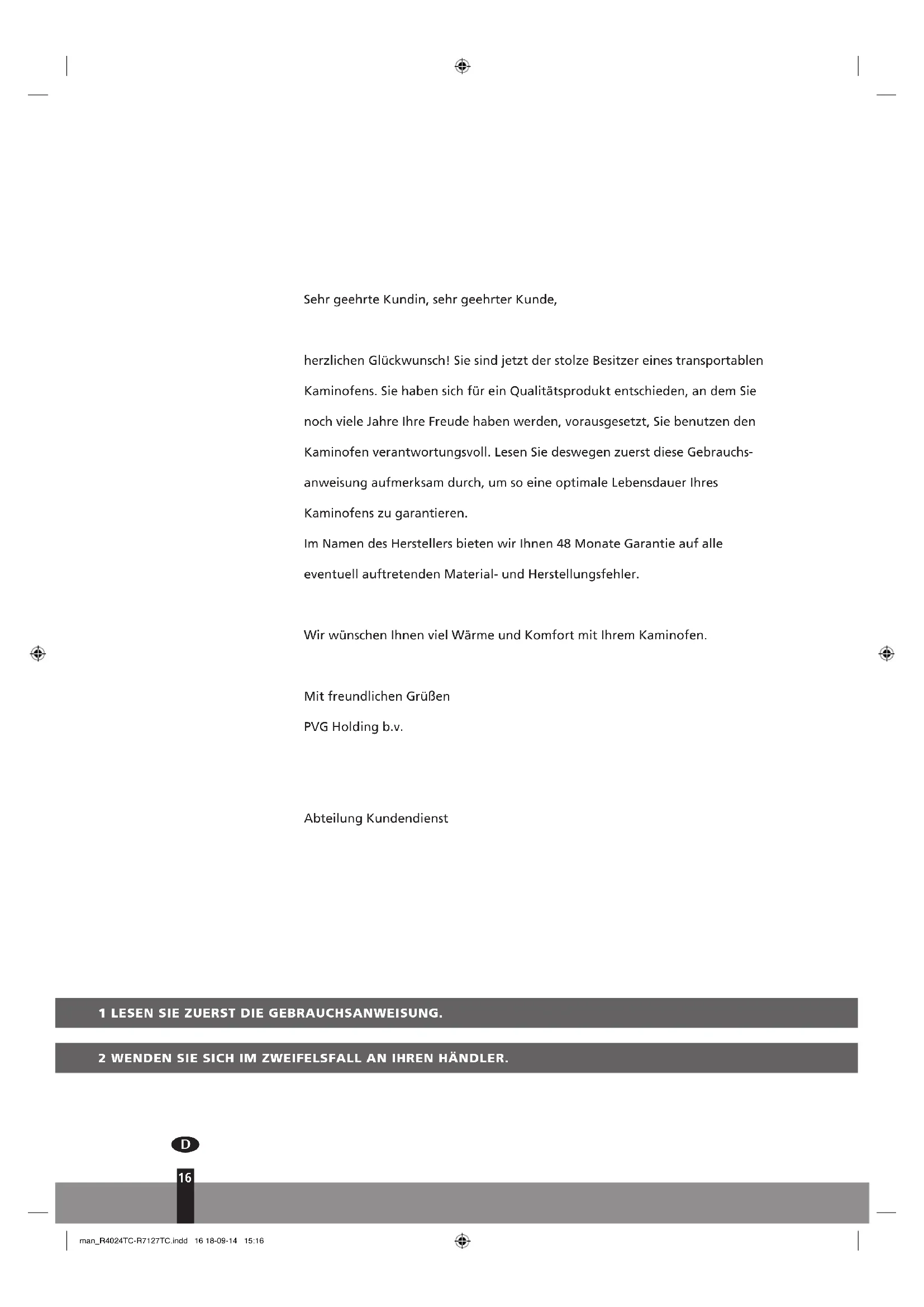 Luftschachtsnachunten.RichtenSiedenDocht- verstellknopfaufdieVorderseitedesOfens. 15.SetzenSiedievierFlügelmutternzurück,aberziehen Siesienochnichtfest. 16.DrehenSiedenDochtindiehöchsteStellungund ziehenSiedieFlügelmutternallmählichfest. 17.PrüfenSiedieDochthöhe.DerDochtmusssich0,8cm überdemBördelflanschbefinden. 18.PrüfenSie,obderZwischenraumzwischenDochthalter undLuftschachtausreichendist.Diesermussüberall gleichgroßsein. 19a.ReaktivierenSiedenUmfallschutz,indemSieden LöschknopfAeindrücken. 19b.SchließenSiedieAnschlüsse(4EA)wiederaufder Printplattean. 20.PrüfenSiedieFunktiondesUmfallschutzes,indemSie denLöschknopfAeindrücken,sodassdasPendelakti- viertwird. 21.SetzenSiedieautomatischeZündungwiederein. 22.SetzenSiedenWindschirmA/Bwiederein. 23.SetzenSiedieZündspiraleKwiederein. 24.SetzenSiedenMantelwiederein. 25.ZiehenSiediefünfSchraubendesMantelsfestund setzenSiedenSensoranderRückseitedesMantels wiederein. 26.SetzenSiedieVerbrennungskammerDundden BrennstofftankIwiederein. 27.SetzenSiedenDrehknopffürdieVerstellungdes DochtsBwiederein.SchließenSiedieVorderplatte. LegenSiedieBatterienindenBatteriehalterundfüllen SiedenBrennstofftankmitQlimaPremiumQualityFuels. SetzenSiedenBrennstofftankindenOfenundwartenSie mindestenseinehalbeStunde,bisderDochtvollständigmit Brennstoffgetränktist. man_R4024TC-R7127TC.indd 27 18-09-14 15:16Kærekunde HjerteligtillykkemedanskaffelsenafDereskamin.DeharanskaffetDemet kvalitetsprodukt,somDekanfåglædeafmangeårfremitiden.Forudsatat ovnenanvendesforsvarligtnaturligvis.Læsderforførstdennebrugsanvisning, såDereskaminkanholdelænge.Påfabrikantensvegnegivervi48måneders garantipåalleopståedemateriale-ogfremstillingsfejl. ViønskerdemmegetvarmeogkomfortmedDereskamin. Medvenlighilsen PVGHoldingb.v. Afdelingkundeservice 1 Læs først bruGsanvisninGen. 2 spørG deres Kamin-HandLer, Hvis de Har yderLiGere spørGsmåL.
