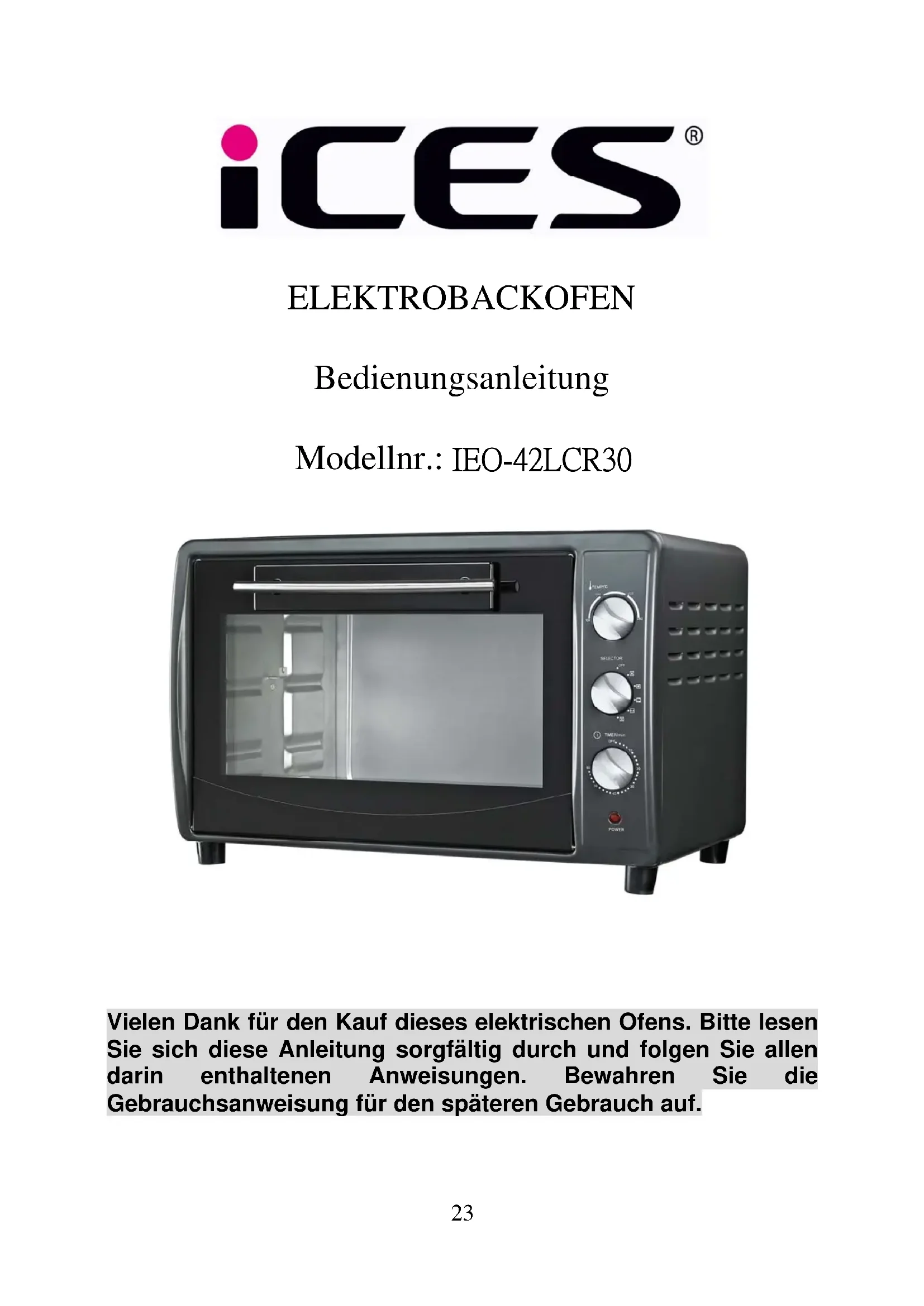 ELEKTROBACKOFEN Bedienungsanleitung Modellnr.: IEO-42LCR30