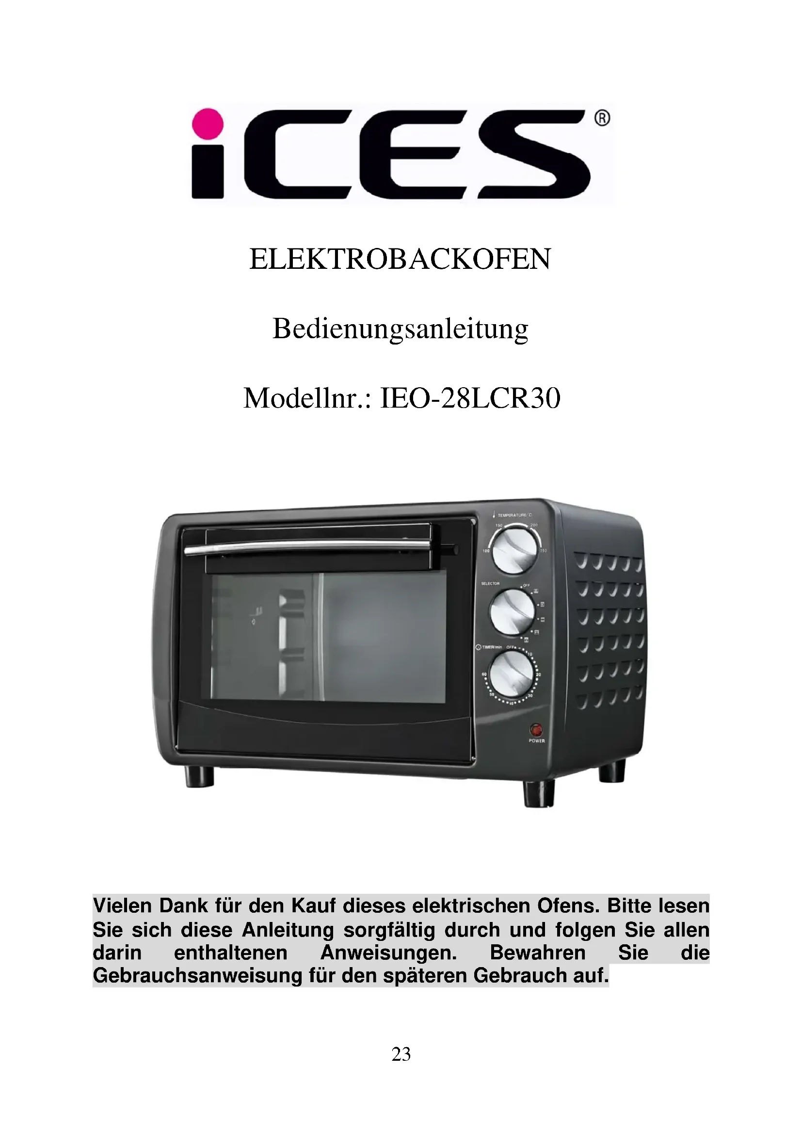 Vielen Dank für den Kauf dieses elektrischen Ofens. Bitte lesen Sie sich diese Anleitung sorgfältig durch und folgen Sie allen darin enthaltenen Anweisungen. Bewahren Sie die Gebrauchsanweisung für den späteren Gebrauch auf.24