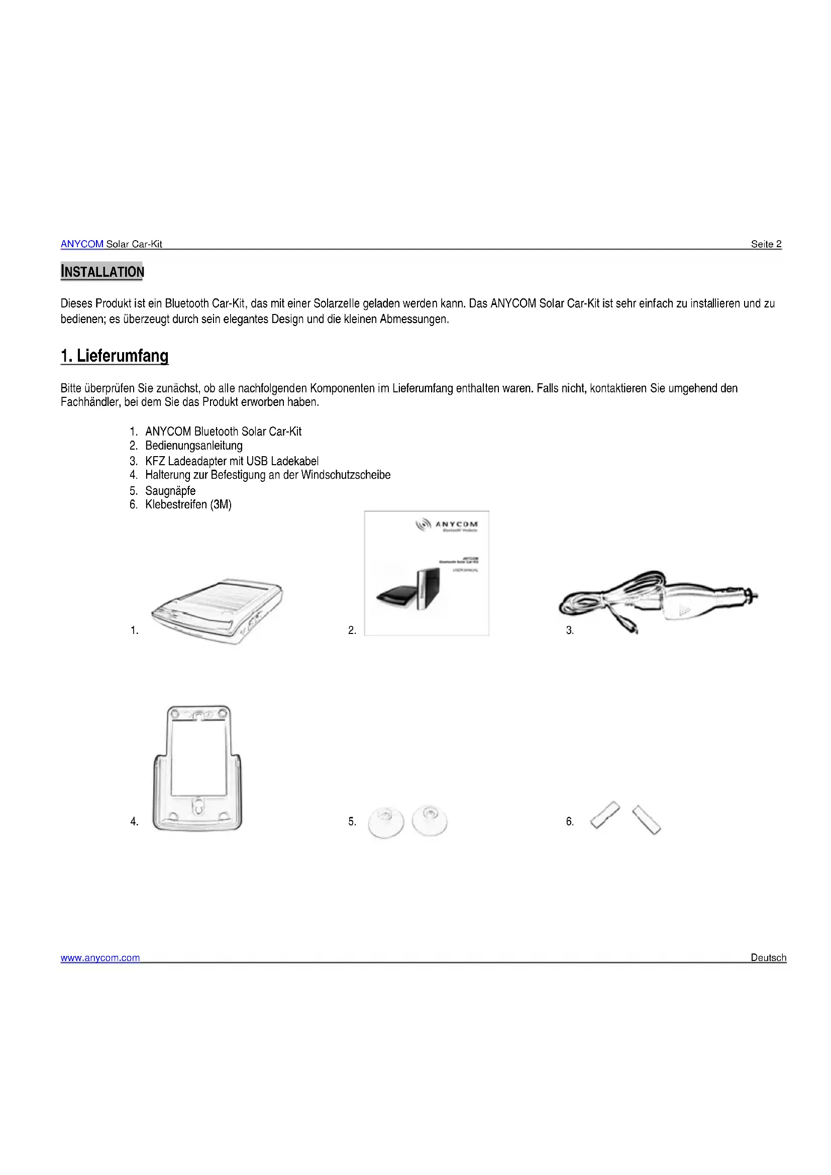 ! ACHTUNG: Benutzen Sie ausschließlich den mitgelieferten KFZ Ladeadapter. Durch die Verwendung eines anderen Ladeadapters kann das Car-Kit zerstört werden.ANYCOM Solar Car-Kit Seite 5 www.anycom.com Deutsch