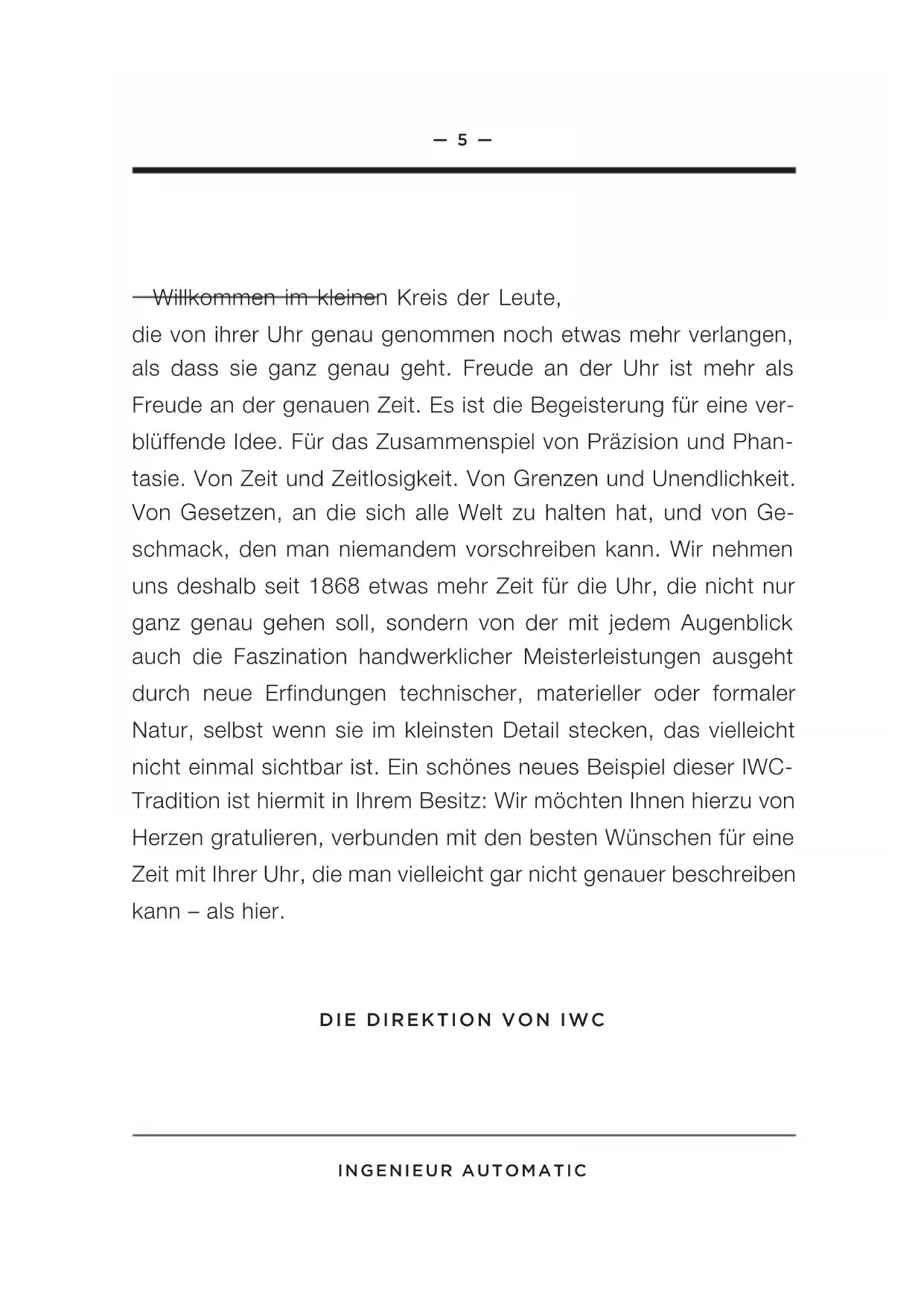 (Direktschaltung). In der Zeit zwischen 20 und 2 Uhr dürfen Sie keine Schnellkorrektur vornehmen, da in dieser Zeit das Datum automatisch vom Uhrwerk weitergeschaltet wird.— 10 — ingenieur autOMatic die zeiteinstellung Ziehen Sie die Krone in Position 2. Dadurch stoppen Sie das Uhr- werk. Für ein sekundengenaues Einstellen ist es vorteilhaft, wenn das Uhrwerk beim Durchgang des Sekundenzeigers über der 60 angehalten wird. Nun können Sie die Zeit durch Drehen der Krone einstellen und den Minutenzeiger exakt zum Minutenstrich positi- onieren. Zum Starten des Sekundenzeigers drücken Sie die Krone wieder in Position 0. Bitte beachten Sie bei der Zeiteinstellung die Datumsschaltung, die jeweils um Mitternacht (24 Uhr) erfolgt. Sollte diese Schaltung schon um 12 Uhr mittags erfolgt sein, müssen Sie die Zeiger um 12 Stunden vorwärtsdrehen. Wichtig: In den Positionen 0, 1 und 2 ist die Uhr zwar wasser- dicht, die Krone muss aber für den normalen Gebrauch immer wieder verschraubt werden (Position X). das zeitaBlesen Bei dunkelheit Das Zifferblatt sowie der Stunden- und Minutenzeiger Ihrer Uhr sind mit Leuchtelementen versehen, die auch bei völliger Dunkel- heit ein einwandfreies Ablesen der Zeit ermöglichen.— 11 — ingenieur autOMatic die Wasserdichtheit Die Wasserdichtheitsangabe erfolgt bei IWC-Uhren in bar und nicht in Metern. Meterangaben, wie sie sonst häufig in der Uh- renindustrie zur Angabe der Wasserdichtheit verwendet werden, können aufgrund der oftmals verwendeten Testverfahren nicht mit der Tiefe eines Tauchganges gleichgesetzt werden. Meteranga- ben lassen deshalb auch keine Rückschlüsse auf die tatsächli- chen Gebrauchsmöglichkeiten bei Feuchtigkeit, Nässe und im bzw. unter Wasser zu. Gebrauchsempfehlungen im Zusammen- hang mit der Wasserdichtheit Ihrer Uhr finden Sie im Internet un- ter www.iwc.com/water-resistance. Gerne informiert Sie auch Ihr autorisierter IWC-Fachhändler (Official Agent). Um eine einwandfreie Funktion Ihrer Uhr sicherzustellen, muss diese mindestens einmal jährlich durch eine IWC-Servicestelle geprüft werden. Eine solche Prüfung muss auch nach ausser- gewöhnlichen Belastungen durchgeführt werden. Werden diese Prüfungen nicht ordnungsgemäss durchgeführt oder wird die Uhr von nicht autorisierten Personen geöffnet, so lehnt IWC jegliche Garantie- oder Haftungsansprüche ab. Empfehlung: Nach jedem Öffnen und Service Ihrer IWC-Uhr muss Ihr autorisierter IWC-Fachhändler (Official Agent) wieder eine Wasserdichtheitsprüfung durchführen.— 12 — ingenieur autOMatic hinWeis Wenn Ihre Uhr mit einem Armband aus Leder, Textil oder Kaut- schuk mit Leder- bzw. Textilinlay versehen ist, vermeiden Sie den Kontakt Ihres hochwertigen Armbandes mit Wasser, öligen Stof- fen, Lösungs- und Reinigungsmitteln oder kosmetischen Produk- ten. Auf diese Weise können Sie Verfärbungen und einer schnel- len Alterung des Materials vorbeugen. der service an ihrer ingenieur autOMatic Alle Bestandteile dieser Uhr sind aus bestem Material gefertigt. Trotzdem unterliegen einige Teile einer natürlichen Abnutzung. Wichtig ist vor allem, dass die Abnutzungsstellen immer optimal geölt sind und dass die Verschmutzung des Öles durch metalli- schen Abrieb rechtzeitig beseitigt wird. Wir empfehlen deshalb, an Ihrer Uhr ca. alle fünf Jahre einen Unterhaltsservice durch- führen zu lassen. Wenden Sie sich dazu an einen autorisierten IWC-Fachhändler (Official Agent) oder direkt an den IWC-Kunden- dienst in Schaffhausen.— 13 — Stand: April 2013. Technische Änderungen vorbehalten. die gehäuseMaterialien gehäuseWerkstOFF kratzFestigkeit BruchFestigkeit geWicht edelstahl niedrig