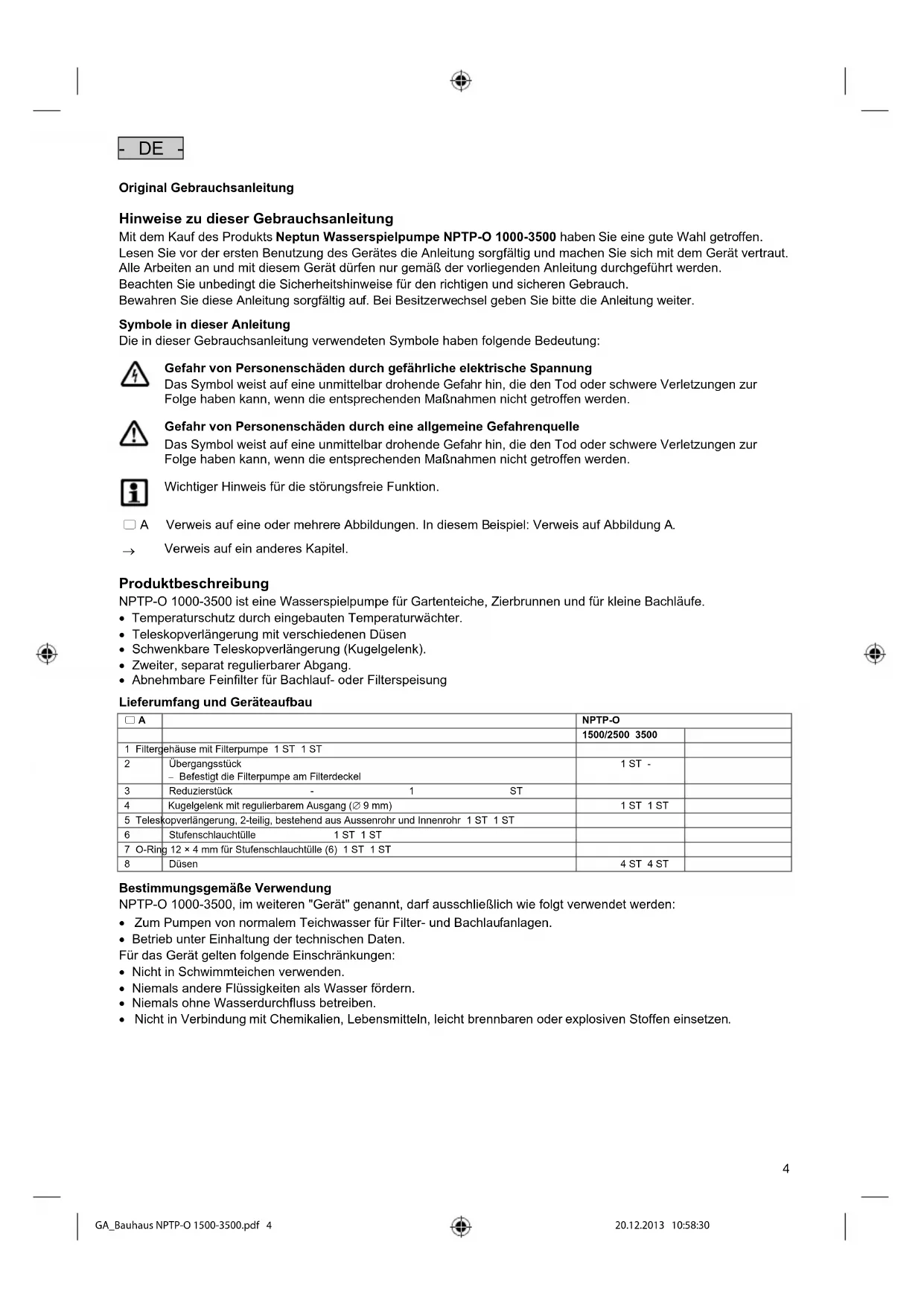 GA_Bauhaus NPTP-O 1500-3500.pdf 3 20.12.2013 10:58:284 - DE - Original Gebrauchsanleitung Hinweise zu dieser Gebrauchsanleitung Mit dem Kauf des Produkts Neptun Wasserspielpumpe NPTP-O 1000-3500 haben Sie eine gute Wahl getroffen. Lesen Sie vor der ersten Benutzung des Gerätes die Anleitung sorgfältig und machen Sie sich mit dem Gerät vertraut. Alle Arbeiten an und mit diesem Gerät dürfen nur gemäß der vorliegenden Anleitung durchgeführt werden. Beachten Sie unbedingt die Sicherheitshinweise für den richtigen und sicheren Gebrauch. Bewahren Sie diese Anleitung sorgfältig auf. Bei Besitzerwechsel geben Sie bitte die Anleitung weiter. Symbole in dieser Anleitung Die in dieser Gebrauchsanleitung verwendeten Symbole haben folgende Bedeutung:
