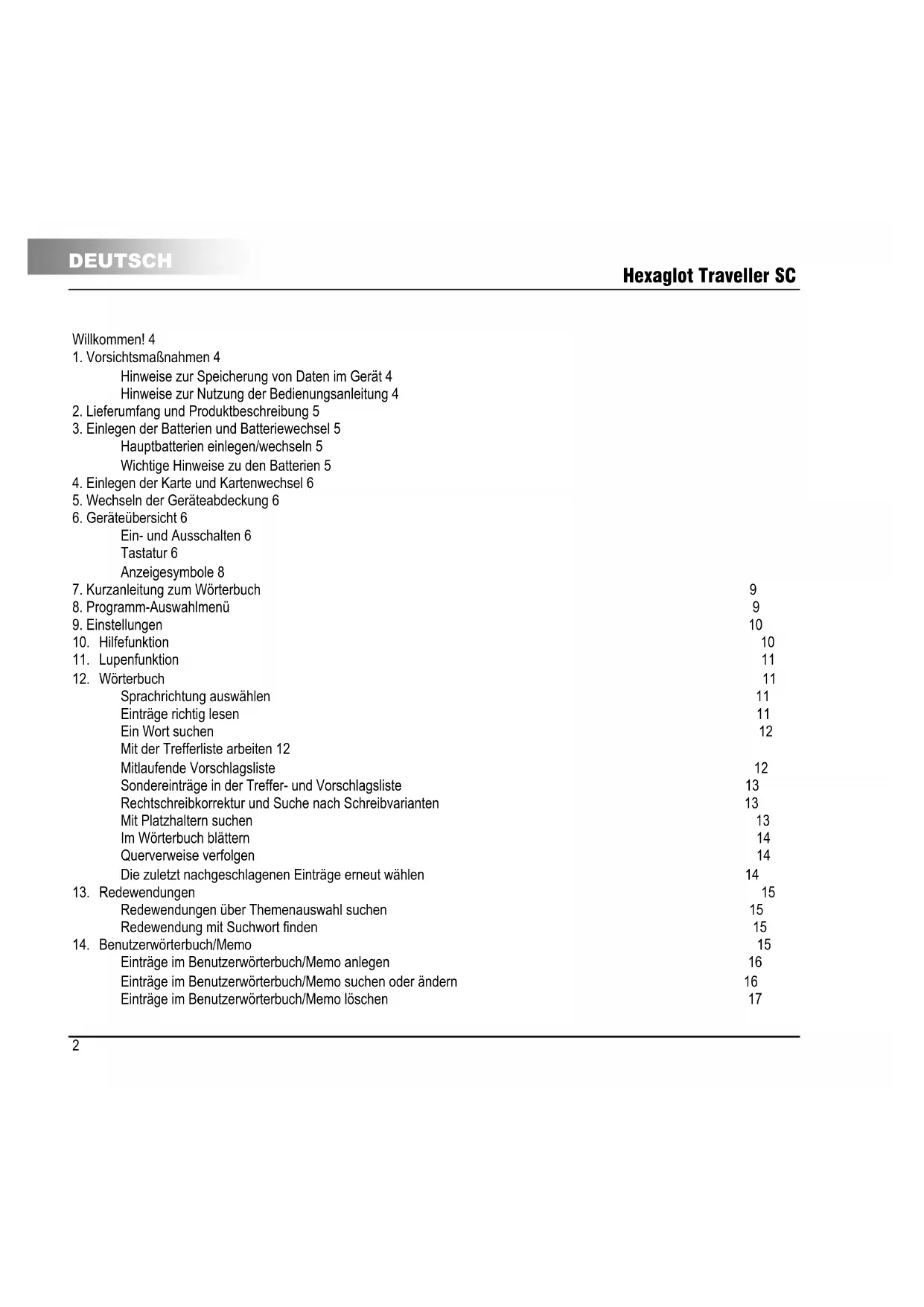 DEUTSCH Willkommen! Vielen Dank, dass Sie sich für den Hexaglot Traveller SC entschieden haben. Bitte nehmen Sie sich ein paar Minuten Zeit, um diese Bedienungsanleitung vor dem ersten Benutzen sorgfältig und vollständig durchzulesen, damit Sie alle Funktionen dieses Gerätes ausschöpfen können und viele Jahre Freude an Ihrem Gerät haben. Bitte bewahren Sie diese Bedienungsanleitung zum späteren Nachschlagen gut auf. Hexaglot wünscht Ihnen viel Erfolg beim Einsatz Ihres Hexaglot Traveller SC!
