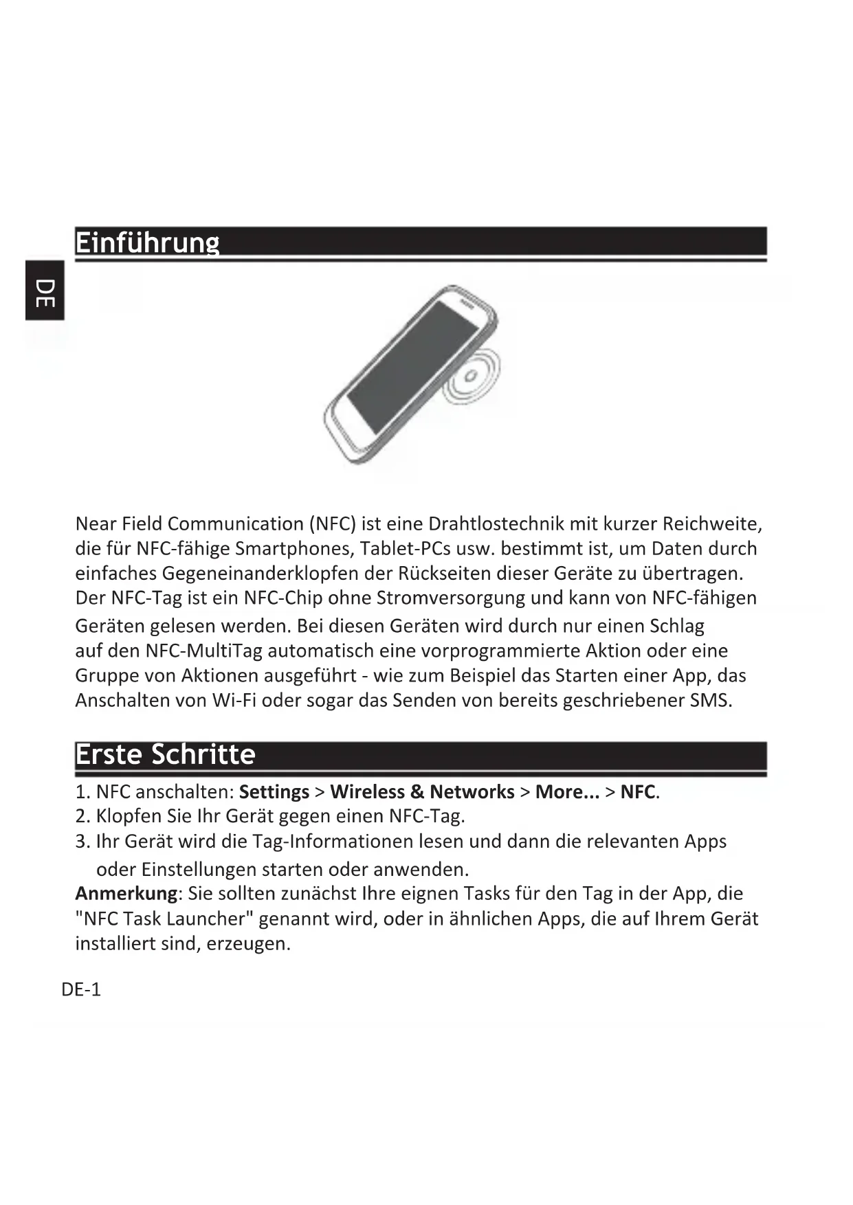 oder Einstellungen starten oder anwenden. Anmerkung: Sie sollten zunächst Ihre eignen Tasks für den Tag in der App, die "NFC Task Launcher" genannt wird, oder in ähnlichen Apps, die auf Ihrem Gerät installiert sind, erzeugen.DE DE-2 Beispiele Beispiel 1 Bettmodus Erzeugen Sie im "NFC Task Launcher" eine Tag-Task für den Bettmodus, wie zum Beispiel Aktivierung des Ruhemodus, Öffnen der Bettuhren-App, Einstellen des Alarms, Ausschalten von Wi-Fi und so weiter. Durch Klopfen auf den NFC-Tag können Sie Ihr Telefon schnell in den Bettmodus bringen, ohne nacheinander Einstellungen vorzunehmen. Beispiel 2 Heimmodus Erzeugen Sie eine Task für einen NFC-Tag, um das Wi-Fi-Netzwerk anzuschalten, schalten Sie GPS aus, und kleben ihn in die Nähe Ihres Wohnungseingangs.DE-3