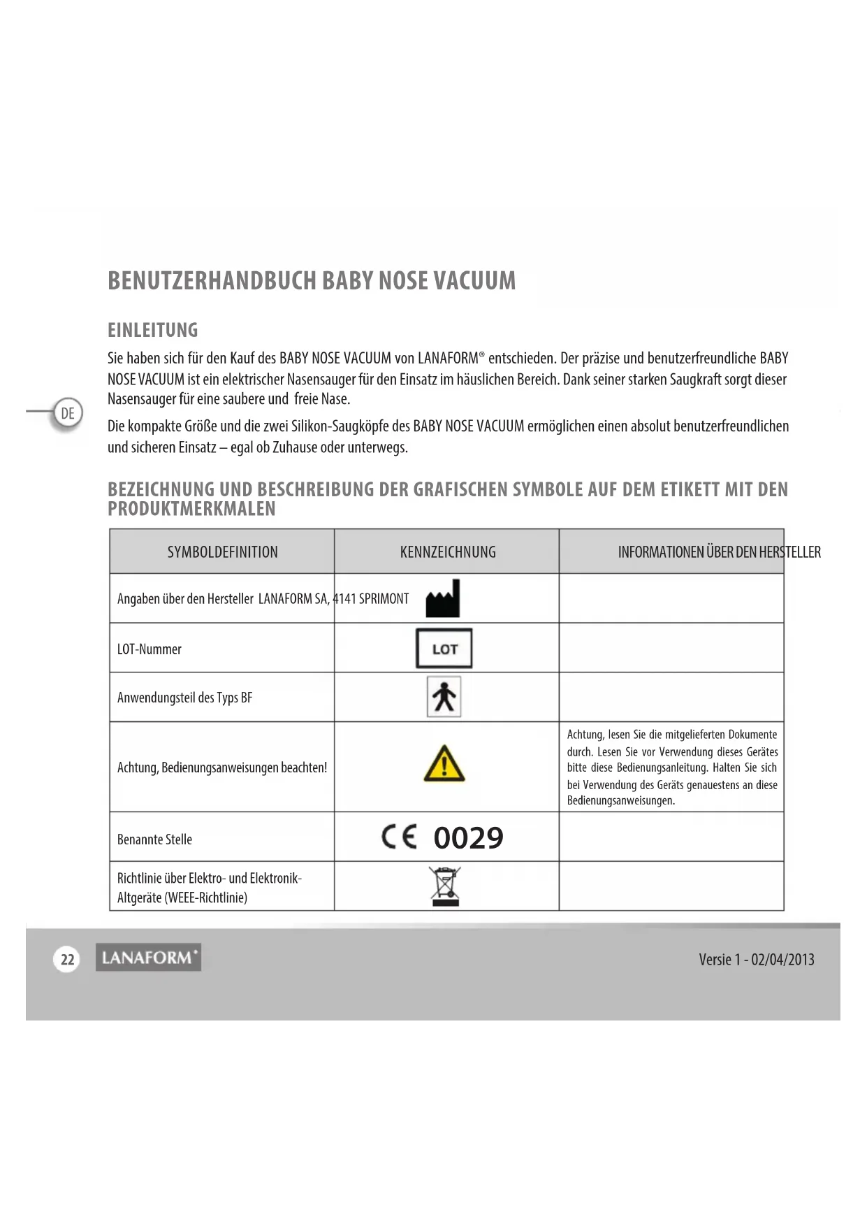 EINLEITUNG Sie haben sich für den Kauf des BABY NOSE VACUUM von LANAFORM® entschieden. Der präzise und benutzerfreundliche BABY NOSE VACUUM ist ein elektrischer Nasensauger für den Einsatz im häuslichen Bereich. Dank seiner starken Saugkraft sorgt dieser Nasensauger für eine saubere und freie Nase. Die kompakte Größe und die zwei Silikon-Saugköpfe des BABY NOSE VACUUM ermöglichen einen absolut benutzerfreundlichen und sicheren Einsatz – egal ob Zuhause oder unterwegs. BEZEICHNUNG UND BESCHREIBUNG DER GRAFISCHEN SYMBOLE AUF DEM ETIKETT MIT DEN PRODUKTMERKMALEN