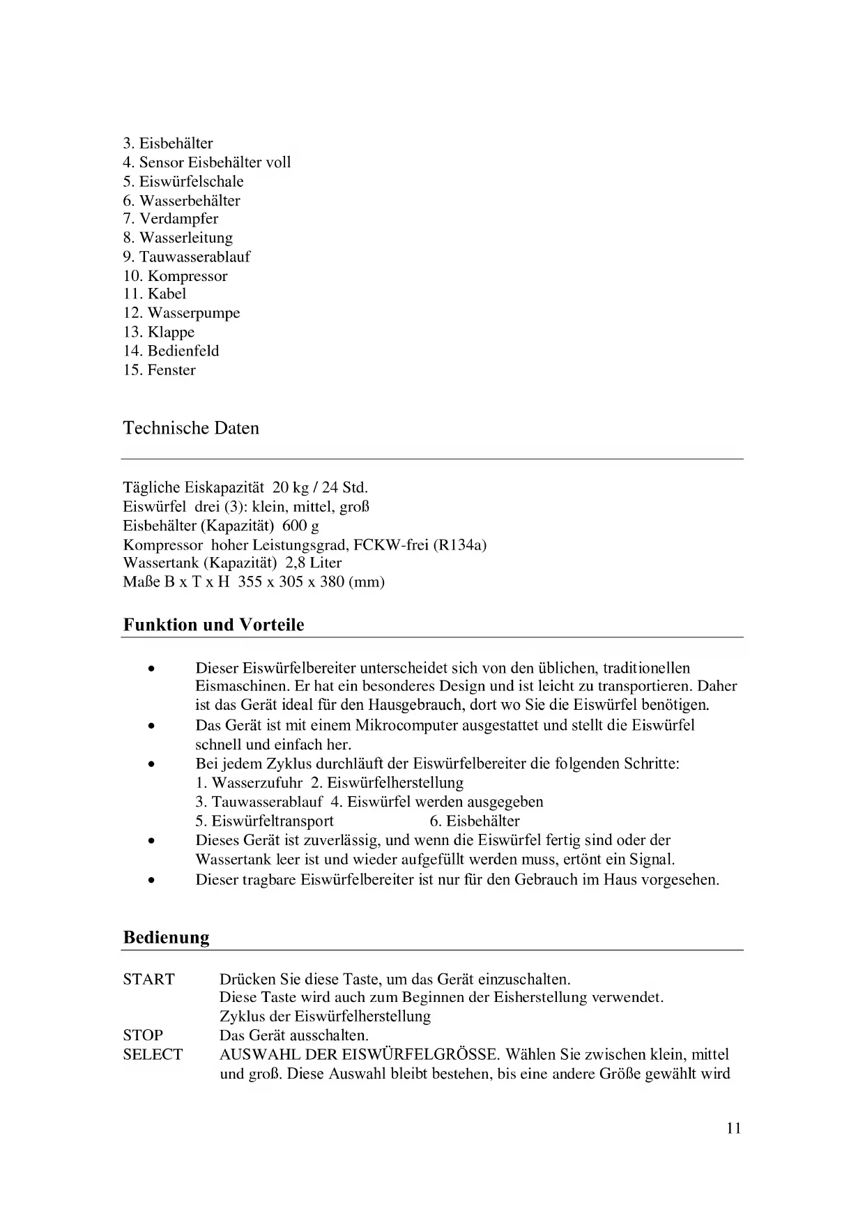 Bedienung START Drücken Sie diese Taste, um das Gerät einzuschalten. Diese Taste wird auch zum Beginnen der Eisherstellung verwendet. Zyklus der Eiswürfelherstellung STOP Das Gerät ausschalten. SELECT AUSWAHL DER EISWÜRFELGRÖSSE. Wählen Sie zwischen klein, mittel und groß. Diese Auswahl bleibt bestehen, bis eine andere Größe gewählt wird12 oder bis die Stromzufuhr des Gerätes unterbrochen wird. Die Standardauswahl ist mittel. Wählen Sie „S“, wenn die Umgebungstemperatur unter 15ºC beträgt. DEFICIENT ZEIGT AN, DASS DER WASSERTANK AUFGEFÜLLT WERDEN MUSS. Das Lämpchen leuchtet und Sie hören einen Piepton. Füllen Sie Wasser nach und drücken Sie STOP. Drücken Sie dann START, um den Eiswürfelbereiter wieder einzuschalten. Der Eisbereiter startet automatisch, wenn das Wasser den Maximalstand erreicht hat. ICE FULL ZEIGT AN, DASS DER EISWÜRFELBEHÄLTER VOLL IST. Dieses Lämpchen schaltet sich ein und Sie hören den Piepton, wenn das Eis die Kapazität des Behälters erschöpft. Drücken Sie auf STOP und dann START, um den Eiswürfelbereiter wieder in Betrieb zu nehmen, wenn Sie einen Teil des Eises entfernt haben. WICHTIG: SIE MÜSSEN „STOP“ UND DANN „START“ DRÜCKEN, UM DAS GERÄT NEU ZU STARTEN, NACHDEM SIE WASSER AUFGEFÜLLT ODER EINEN TEIL DES EISES ENTFERNT HABEN. Sicherheit und Aufstellung WICHTIGE SICHERHEITSHINWEISE WARNUNG: Zur Vermeidung von Brandgefahr, Stromschlag oder persönlicher Verletzung müssen Sie diese Sicherheitsanweisungen befolgen: