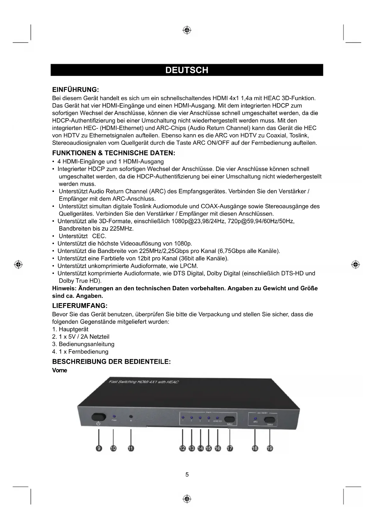 udio Cable5 DEUTSCH HDMI-Switch mit 4 Anschlüssen EINFÜHRUNG: Bei diesem Gerät handelt es sich um ein schnellschaltendes HDMI 4x1 1,4a mit HEAC 3D-Funktion. Das Gerät hat vier HDMI-Eingänge und einen HDMI-Ausgang. Mit dem integrierten HDCP zum sofortigen Wechsel der Anschlüsse, können die vier Anschlüsse schnell umgeschaltet werden, da die HDCP-Authentifizierung bei einer Umschaltung nicht wiederhergestellt werden muss. Mit den integrierten HEC- (HDMI-Ethernet) und ARC-Chips (Audio Return Channel) kann das Gerät die HEC von HDTV zu Ethernetsignalen aufteilen. Ebenso kann es die ARC von HDTV zu Coaxial, Toslink, Stereoaudiosignalen vom Quellgerät durch die Taste ARC ON/OFF auf der Fernbedienung aufteilen. FUNKTIONEN & TECHNISCHE DATEN: