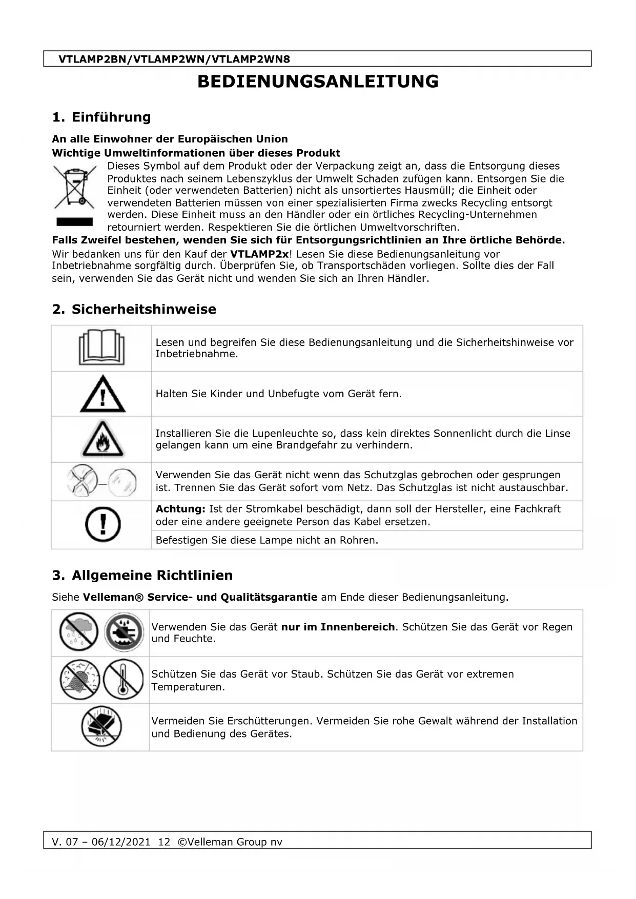 Laden Sie die Anleitung für Ihr Lampe kostenlos im PDF-Format! Finden Sie Ihr Handbuch VTLAMP2BN - VELLEMAN und nehmen Sie Ihr elektronisches Gerät wieder in die Hand. Auf dieser Seite sind alle Dokumente veröffentlicht, die für die Verwendung Ihres Geräts notwendig sind. VTLAMP2BN von der Marke VELLEMAN.