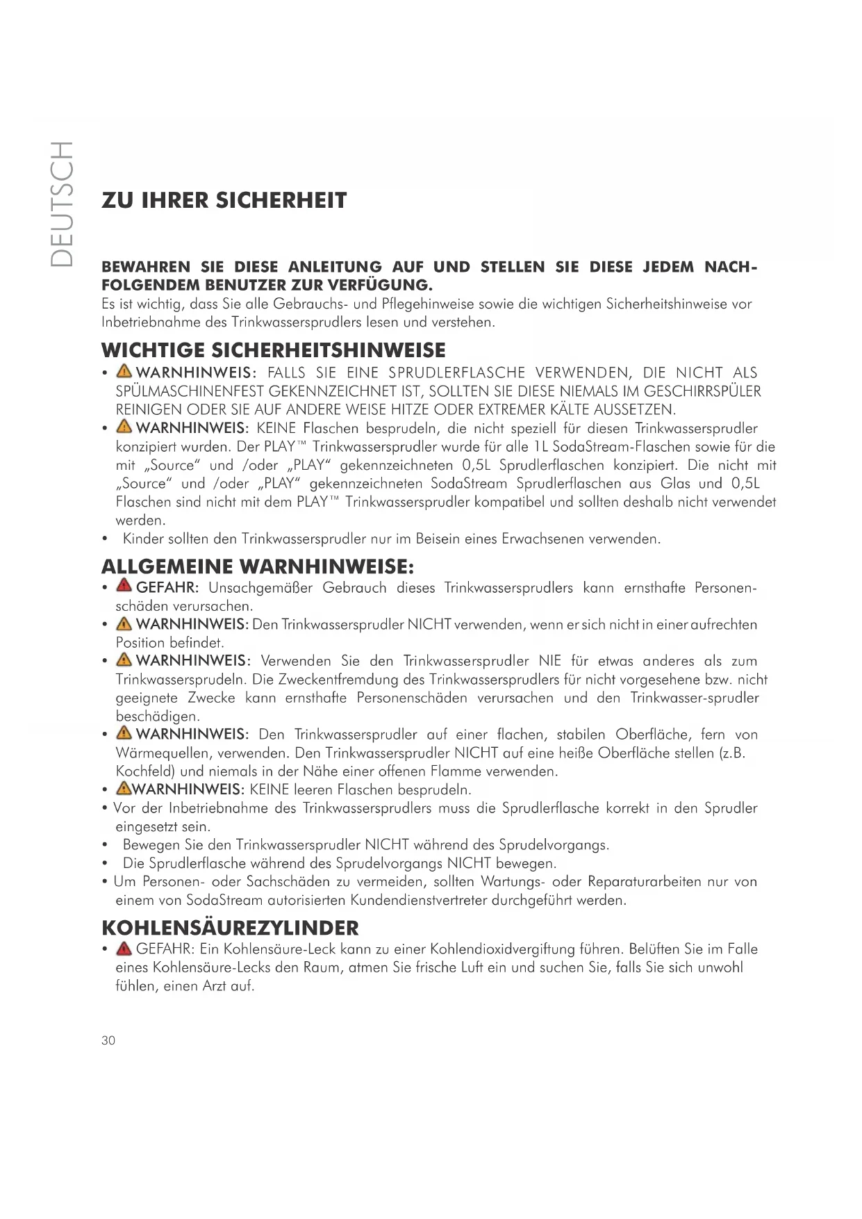 L'emballage est fabriqué à partir de matériaux recyclés. Contactez votre commune pour obtenir plus d'informations concernant le recyclage. CARACTÉRISTIQUES SPÉCIFICATIONS DE LA MACHINE : Pression de service maximum : 145 PSI/10 bars Température de service maximale autorisée : 40°C Capacité de la bouteille : 1 litre SODASTREAM est une marque déposée de SodaStream International Ltd. ou de ses affiliés. www.facebook.com/SodaStream.France www.youtube.com/user/sodastreamguru BENELUX: SodaStream Internation BV Provinciënbaan 16, 5121 DL Rijen, Pay-Bas Tel: 0800 - 0223637 (NL) wwwsodastream.nl Tel: 0880 - 74807 (BE) www.sodastream.be30 DEUTSCH BEWAHREN SIE DIESE ANLEITUNG AUF UND STELLEN SIE DIESE JEDEM NACH- FOLGENDEM BENUTZER ZUR VERFÜGUNG. Es ist wichtig, dass Sie alle Gebrauchs- und Pflegehinweise sowie die wichtigen Sicherheitshinweise vor Inbetriebnahme des Trinkwassersprudlers lesen und verstehen. WICHTIGE SICHERHEITSHINWEISE WARNHINWEIS: FALLS SIE EINE SPRUDLERFLASCHE VERWENDEN, DIE NICHT ALS SPÜLMASCHINENFEST GEKENNZEICHNET IST, SOLLTEN SIE DIESE NIEMALS IM GESCHIRRSPÜLER REINIGEN ODER SIE AUF ANDERE WEISE HITZE ODER EXTREMER KÄLTE AUSSETZEN. WARNHINWEIS: KEINE Flaschen besprudeln, die nicht speziell für diesen Trinkwassersprudler konzipiert wurden. Der PLAY™ Trinkwassersprudler wurde für alle 1L SodaStream-Flaschen sowie für die mit „Source“ und /oder „PLAY“ gekennzeichneten 0,5L Sprudlerflaschen konzipiert. Die nicht mit „Source“ und /oder „PLAY“ gekennzeichneten SodaStream Sprudlerflaschen aus Glas und 0,5L Flaschen sind nicht mit dem PLAY™ Trinkwassersprudler kompatibel und sollten deshalb nicht verwendet werden. Kinder sollten den Trinkwassersprudler nur im Beisein eines Erwachsenen verwenden. ALLGEMEINE WARNHINWEISE: GEFAHR: Unsachgemäßer Gebrauch dieses Trinkwassersprudlers kann ernsthafte Personen- schäden verursachen. WARNHINWEIS: Den Trinkwassersprudler NICHT verwenden, wenn er sich nicht in einer aufrechten Position befindet. WARNHINWEIS: Verwenden Sie den Trinkwassersprudler NIE für etwas anderes als zum Trinkwassersprudeln. Die Zweckentfremdung des Trinkwassersprudlers für nicht vorgesehene bzw. nicht geeignete Zwecke kann ernsthafte Personenschäden verursachen und den Trinkwasser-sprudler beschädigen. WARNHINWEIS: Den Trinkwassersprudler auf einer flachen, stabilen Oberfläche, fern von Wärmequellen, verwenden. Den Trinkwassersprudler NICHT auf eine heiße Oberfläche stellen (z.B. Kochfeld) und niemals in der Nähe einer offenen Flamme verwenden. WARNHINWEIS: KEINE leeren Flaschen besprudeln. Vor der Inbetriebnahme des Trinkwassersprudlers muss die Sprudlerflasche korrekt in den Sprudler eingesetzt sein. Bewegen Sie den Trinkwassersprudler NICHT während des Sprudelvorgangs. Die Sprudlerflasche während des Sprudelvorgangs NICHT bewegen. Um Personen- oder Sachschäden zu vermeiden, sollten Wartungs- oder Reparaturarbeiten nur von einem von SodaStream autorisierten Kundendienstvertreter durchgeführt werden. KOHLENSÄUREZYLINDER GEFAHR: Ein Kohlensäure-Leck kann zu einer Kohlendioxidvergiftung führen. Belüften Sie im Falle eines Kohlensäure-Lecks den Raum, atmen Sie frische Luft ein und suchen Sie, falls Sie sich unwohl fühlen, einen Arzt auf.