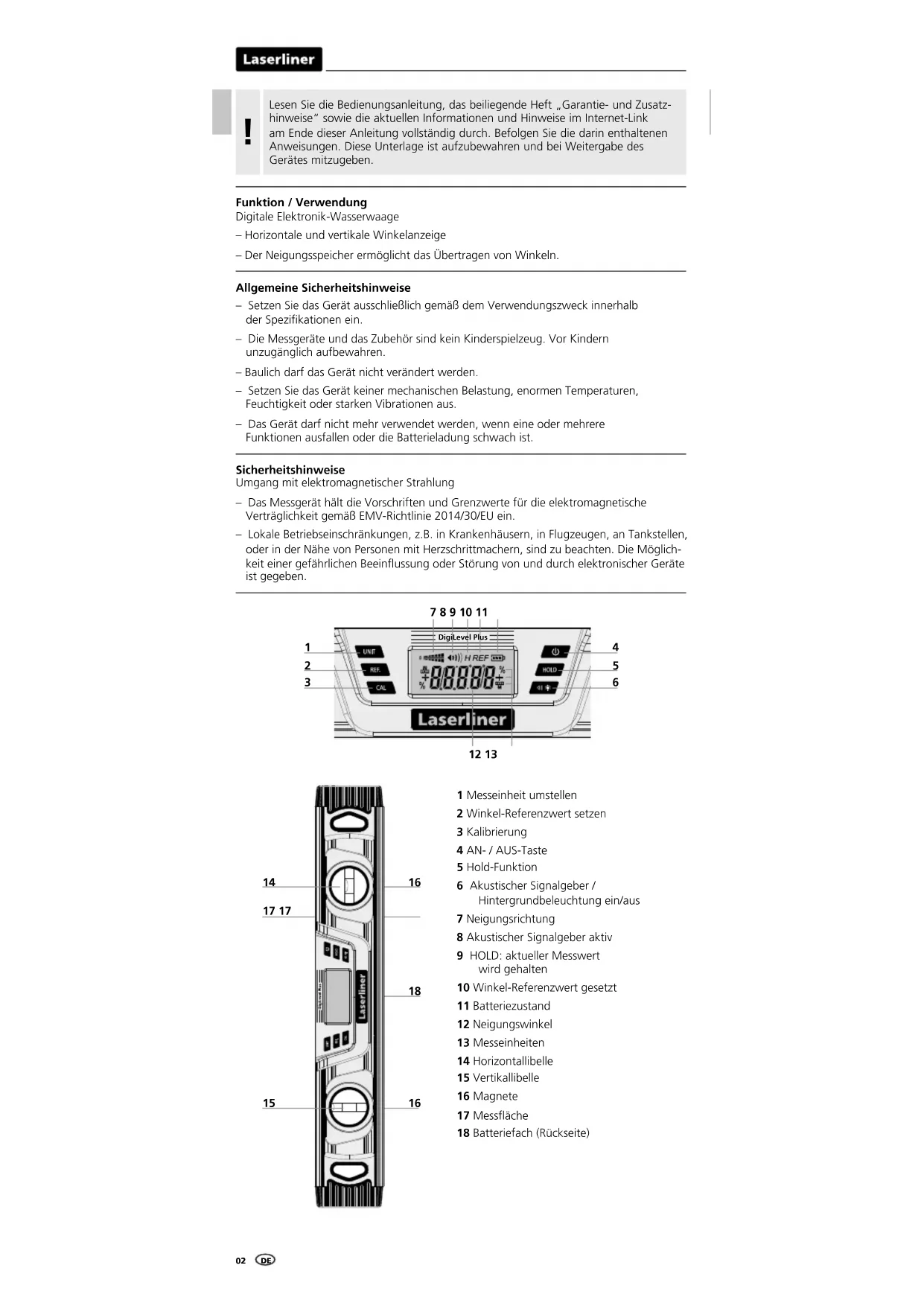 1 Messeinheit umstellen 2 Winkel-Referenzwert setzen 3 Kalibrierung 4 AN- / AUS-Taste 5 Hold-Funktion 6 Akustischer Signalgeber / Hintergrundbeleuchtung ein/aus 7 Neigungsrichtung 8 Akustischer Signalgeber aktiv 9 HOLD: aktueller Messwert wird gehalten 10 Winkel-Referenzwert gesetzt 11 Batteriezustand 12 Neigungswinkel 13 Messeinheiten 14 Horizontallibelle 15 Vertikallibelle 16 Magnete 17 Messäche 18 Batteriefach (Rückseite)DigiLevel Plus