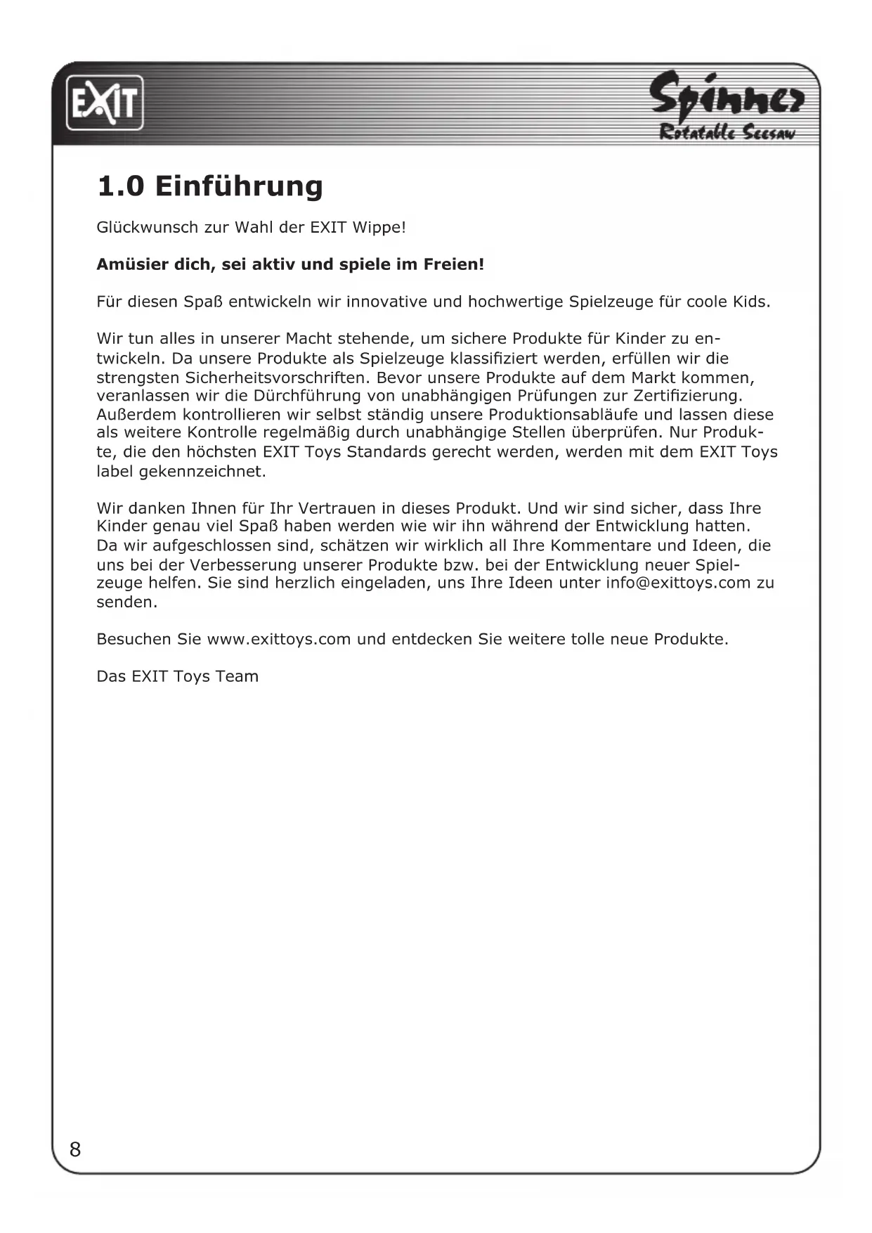 Wir danken Ihnen für Ihr Vertrauen in diesen Produkt. Und wir sind sicher, dass ihre Kinder genau viel Spaß haben werden wie wir ihn während der Entwicklung hatten. Da wir aufgeschlossen sind, schätzen wir wirklich all ihre Kommentare und Ideen, die uns bei der Verbesserung unserer Produkte bzw. bei der Entwicklung neuer Spiel-zeuge halten. Sie sind herzlich eingeladen, uns ihre Ideen unter info@exittoys.com zu senden.