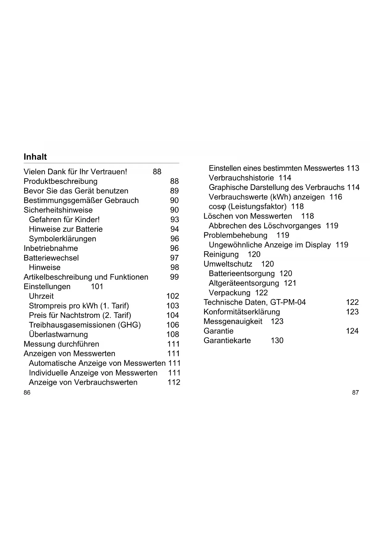 Einstellen eines bestimmten Messwertes 113 Verbrauchshistorie 114 Graphische Darstellung des Verbrauchs 114 Verbrauchswerte (kWh) anzeigen 116 cosφ (Leistungsfaktor) 118 Löschen von Messwerten 118 Abbrechen des Löschvorganges 119 Problembehebung 119 Ungewöhnliche Anzeige im Display 119 Reinigung 120 Umweltschutz 120 Batterieentsorgung 120 Altgeräteentsorgung 121 Verpackung 122 Technische Daten, GT-PM-04 122 Konformitätserklärung 123 Messgenauigkeit 123 Garantie 124 Garantiekarte 130 Inhalt Vielen Dank für Ihr Vertrauen! 88 Produktbeschreibung 88 Bevor Sie das Gerät benutzen 89 Bestimmungsgemäßer Gebrauch 90 Sicherheitshinweise 90 Gefahren für Kinder! 93 Hinweise zur Batterie 94 Symbolerklärungen 96 Inbetriebnahme 96 Batteriewechsel 97 Hinweise 98 Artikelbeschreibung und Funktionen 99 Einstellungen 101 Uhrzeit 102 Strompreis pro kWh (1. Tarif) 103 Preis für Nachtstrom (2. Tarif) 104 Treibhausgasemissionen (GHG) 106 Überlastwarnung 108 Messung durchführen 111 Anzeigen von Messwerten 111 Automatische Anzeige von Messwerten 111 Individuelle Anzeige von Messwerten 111 Anzeige von Verbrauchswerten 11288