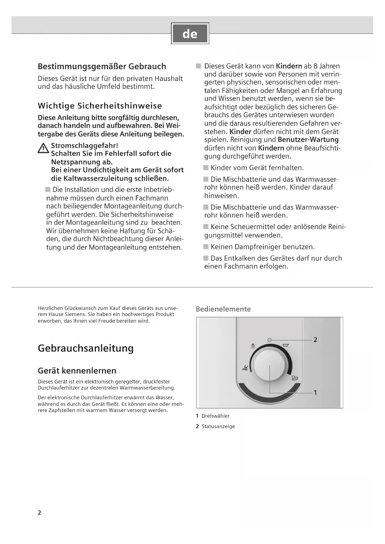 Bestimmungsgemäßer Gebrauch Dieses Gerät ist nur für den privaten Haushalt und das häusliche Umfeld bestimmt. Wichtige Sicherheitshinweise Diese Anleitung bitte sorgfältig durchlesen, danach handeln und aufbewahren. Bei Wei- tergabe des Geräts diese Anleitung beilegen. Stromschlaggefahr! Schalten Sie im Fehlerfall sofort die Netzspannung ab. Bei einer Undichtigkeit am Gerät sofort die Kaltwasserzuleitung schließen. ■ Die Installation und die erste Inbetrieb- nahme müssen durch einen Fachmann nach beiliegender Montageanleitung durch- geführt werden. Die Sicherheitshinweise in der Montageanleitung sind zu beachten. Wir übernehmen keine Haftung für Schä- den, die durch Nichtbeachtung dieser Anlei- tung und der Montageanleitung entstehen. ■ Dieses Gerät kann von Kindern ab 8 Jahren und darüber sowie von Personen mit verrin- gerten physischen, sensorischen oder men- talen Fähigkeiten oder Mangel an Erfahrung und Wissen benutzt werden, wenn sie be- aufsichtigt oder bezüglich des sicheren Ge- brauchs des Gerätes unterwiesen wurden und die daraus resultierenden Gefahren ver- stehen. Kinder dürfen nicht mit dem Gerät spielen. Reinigung und Benutzer-Wartung dürfen nicht von Kindern ohne Beaufsichti- gung durchgeführt werden. ■ Kinder vom Gerät fernhalten. ■ Die Mischbatterie und das Warmwasser- rohr können heiß werden. Kinder darauf hinweisen. ■ Die Mischbatterie und das Warmwasser- rohr können heiß werden. ■ Keine Scheuermittel oder anlösende Reini- gungsmittel verwenden. ■ Keinen Dampfreiniger benutzen. ■ Das Entkalken des Gerätes darf nur durch einen Fachmann erfolgen. Herzlichen Glückwunsch zum Kauf dieses Geräts aus unse-rem Hause Siemens. Sie haben ein hochwertiges Produkt erworben, das Ihnen viel Freude bereiten wird. Gebrauchsanleitung Gerät kennenlernen Dieses Gerät ist ein elektronisch geregelter, druckfester Durchlauferhitzer zur dezentralen Warmwasserbereitung.Der elektronische Durchlauferhitzer erwärmt das Wasser, während es durch das Gerät fließt. Es können eine oder meh-rere Zapfstellen mit warmem Wasser versorgt werden. Bedienelemente