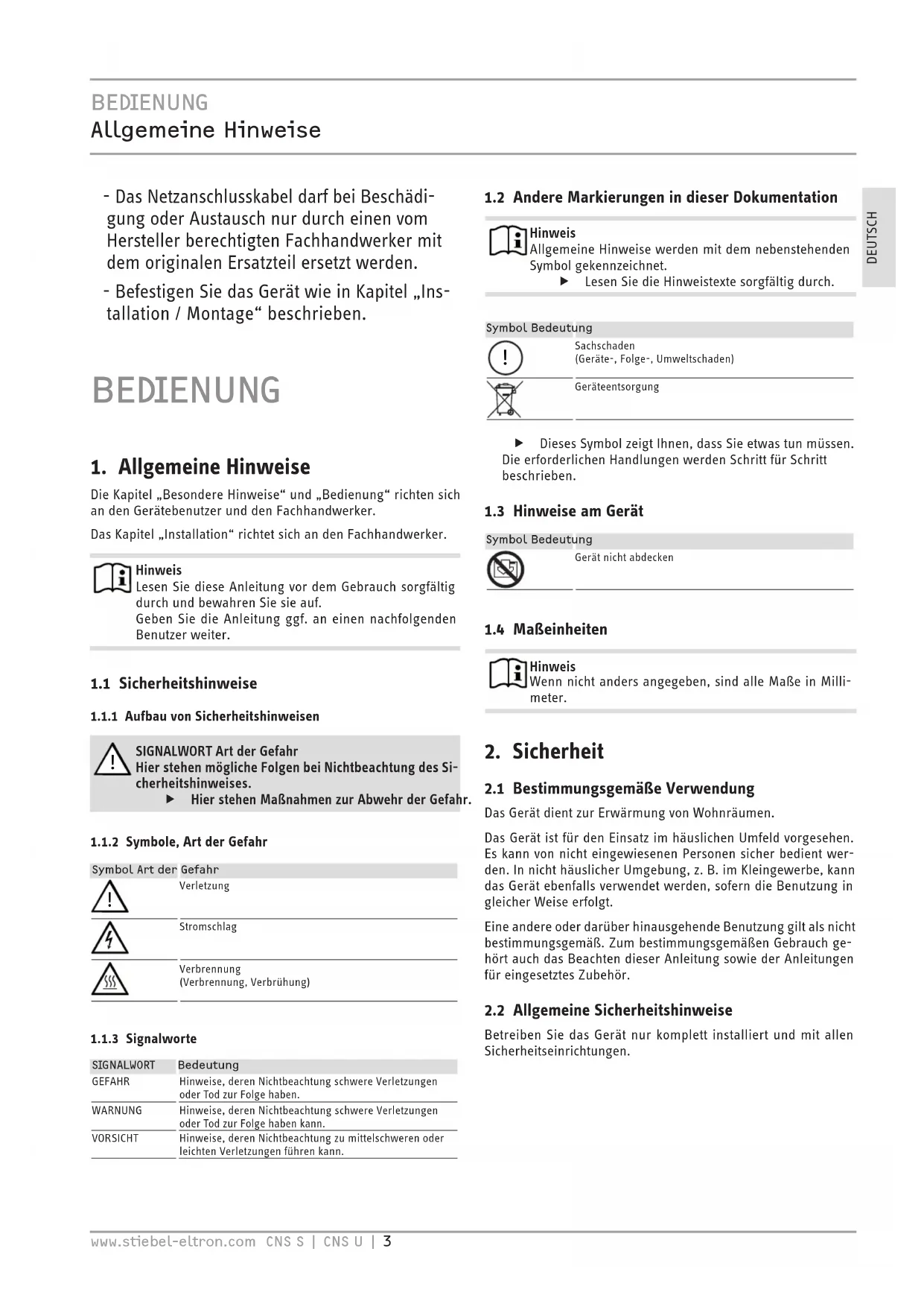 WandkonvektorBEDIENUNG Allgemeine Hinweise DEUTSCHwww.stiebel-eltron.com CNS S | CNS U | 3 - Das Netzanschlusskabel darf bei Beschädi-gung oder Austausch nur durch einen vom Hersteller berechtigten Fachhandwerker mit dem originalen Ersatzteil ersetzt werden. - Befestigen Sie das Gerät wie in Kapitel „Ins-tallation/ Montage“ beschrieben. BEDIENUNG
