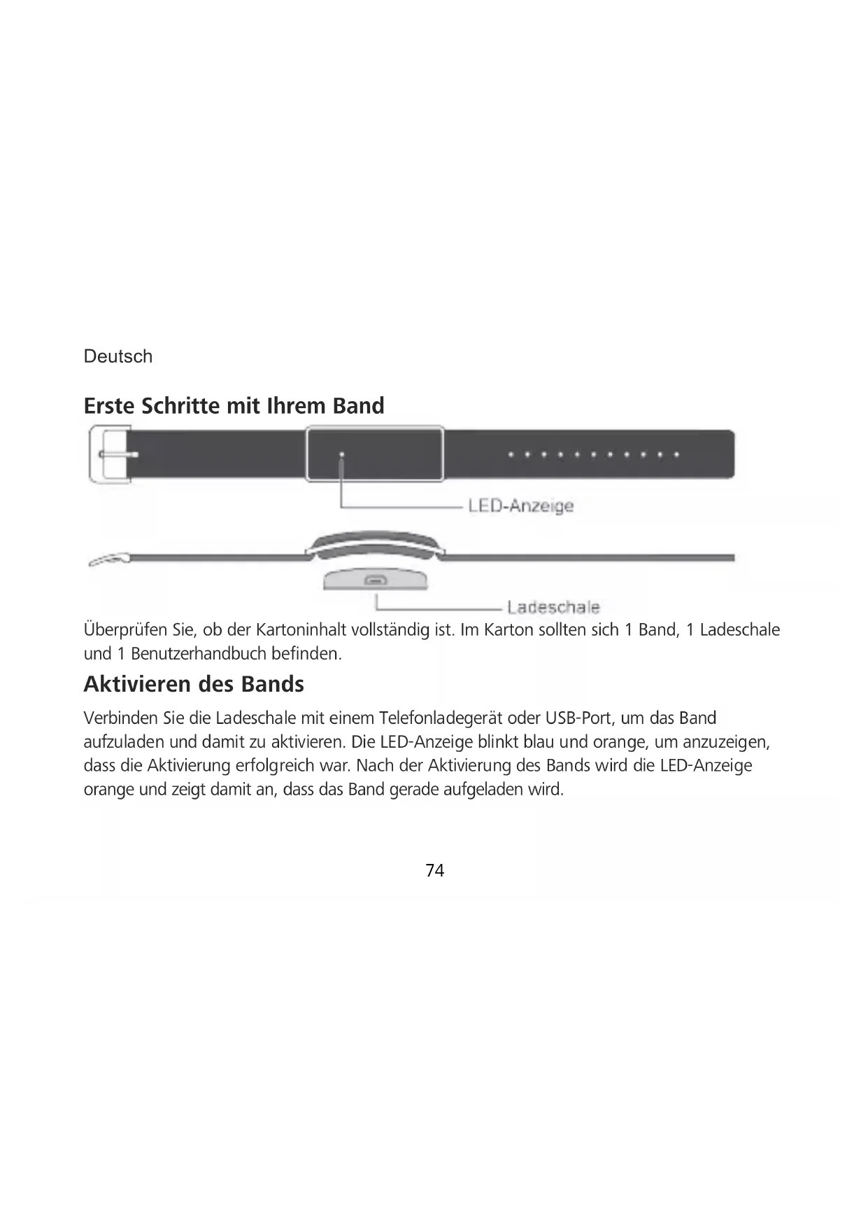 Überprüfen Sie, ob der Kartoninhalt vollständig ist. Im Karton sollten sich 1 Band, 1 Ladeschale und 1 Benutzerhandbuch befinden. Aktivieren des Bands Verbinden Sie die Ladeschale mit einem Telefonladegerät oder USB-Port, um das Band aufzuladen und damit zu aktivieren. Die LED-Anzeige blinkt blau und orange, um anzuzeigen, dass die Aktivierung erfolgreich war. Nach der Aktivierung des Bands wird die LED-Anzeige orange und zeigt damit an, dass das Band gerade aufgeladen wird.Deutsch