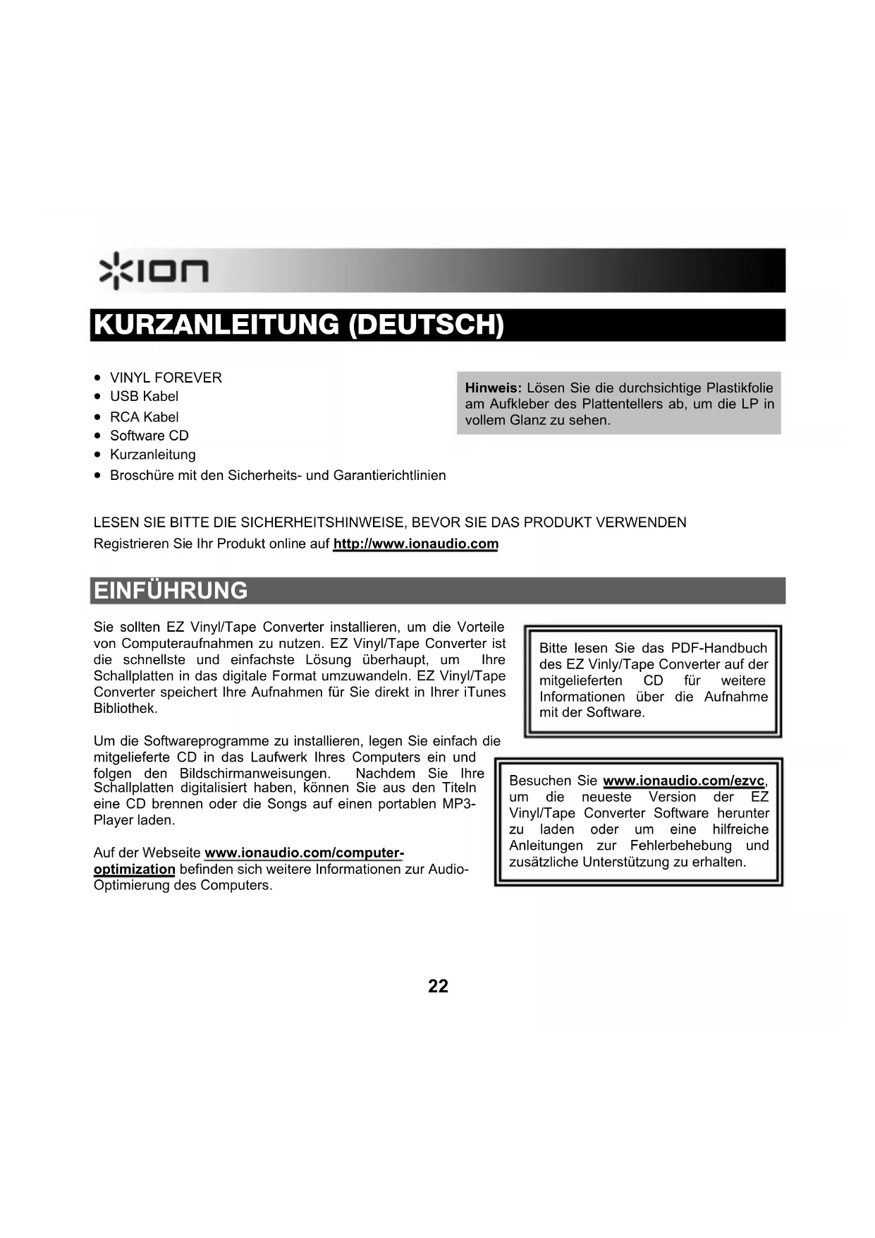 - Broschüre mit den Sicherheits- und Garantierichtlinien LESEN SIE BITTE DIE SICHERHEITSHINWEISE, BEVOR SIE DAS PRODUKT VERWENDEN Registrieren Sie Ihr Produkt online auf http://www.ionaudio.com EINFÜHRUNG Sie sollten EZ Vinyl/Tape Converter installieren, um die Vorteile von Computeraufnahmen zu nutzen. EZ Vinyl/Tape Converter ist die schnellste und einfachste Lösung überhaupt, um Ihre Schallplatten in das digitale Format umzuwandeln. EZ Vinyl/Tape Converter speichert Ihre Aufnahmen für Sie direkt in Ihrer iTunes Bibliothek. Um die Softwareprogramme zu installieren, legen Sie einfach die mitgelieferte CD in das Laufwerk Ihres Computers ein und folgen den Bildschirmanweisungen. Nachdem Sie Ihre Schallplatten digitalisiert haben, können Sie aus den Titeln eine CD brennen oder die Songs auf einen portablen MP3- Player laden. Auf der Webseite www.ionaudio.com/computer- optimization befinden sich weitere Informationen zur Audio- Optimierung des Computers.