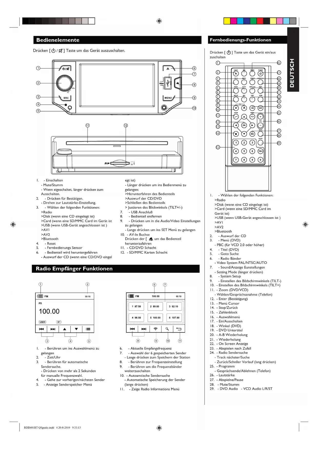 Radio Empfänger Funktionen Fernbedienungs-Funktionen Bedienelemente Drücken[]TasteumdasGerätauszuschalten. Drücken[]TasteumdasGerätein/aus zuschalten DEUTSCH RDD401BT QSguide.indd 4 20-8-2010 9:33:13USB Mariah Carey No fatman scoop It’s Like That 3:02 13:04 USB Leave me alone When I’m gone BerührenSieeinSymbolumdie gewünschteFunktionauszuführen. 1.UntertitelAuswahl 2.WiederholtesAbspielen 3.AudioAuswahl 4.MenüAbspielen 5.TitelAuswahl 6.Trackspringen/suchen 7.Abspielen/Pause 8.Stop 9.AnzeigeAudio/VideoEinstellungsmenü DVD Abspiel Menu BerührenSiedenBildschirminderMittewährendeine CD/DVDabgespieltwird: BerührenSieeinSymbolumdie gewünschteFunktionauszuführen. 1.ZufälligesAbspielen 2.WiederholtesAbspielen 3.AudioAuswahl 4.MenüAbspielen 5.Trackspringen/suchen 6.Abspielen/Pause 7.Stop 8.AnzeigeAudio/VideoEinstellungsmenü Video VCD Abspiel Menü BerührenSiedenBildschirminderMitte währendeineCDabgespieltwird: BerührenSieeinSymbolumdiegewünschte Funktionauszuführen 1.DrehendesBildlinks/rechts. 2.SpiegelndesBildvertikal/horizontal 3.Zoom 4.Vorheriges/nächstesBild 5.Abspielen/Pause 6.Stop 7.AnzeigeAudio/VideoEinstellungsmenü PHOTO Menü BerührenSiedenBildschirminderMitte: CD/MP3 Abspiel Menü 1.AnzeigedesHauptmenüs 2.AktuelleTitelnummer/Gesamtanzahlder Titel 3.Abspielzeit 4.Abspielinformation 5.Titelspringen/suchen 6.Abspielen/Pause 7.Stop 8.ZeigenächstesMenü MP3/MPEG4/PHOTO Menü BerührenSieeinSymbolumdiegewünschte Funktionauszuführen. 1.DrehendesBildlinks/rechts. 2.SpiegelndesBildvertikal/horizontal 3.Zoom 4.Vorheriges/nächstesBild 5.Abspielen/Pause 6.Stop 7.Displayaudio/videosettingmenu 1.ZurückzumHauptmenü. 2.BluetoothSymbol 3.Zeit/Uhr 4.Wählen 5.AnzeigeProtokollMenü 6.NummernEingabe 7.Auegen 8.NächstesMenü 9.PairingListe 10.VorherigerTrack 11.Abspielen/Pause 12.NächsterTrack 13.VorherigesMenü Pairing BenutzenSiedieseFunktionumeineVerbindung zwischendemRadioundIhremMobilTelefon herzustellen.