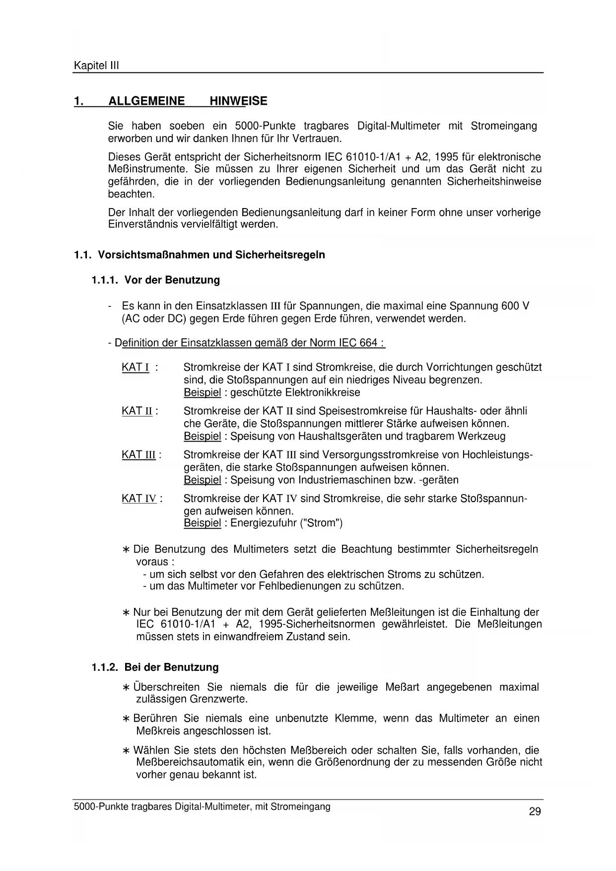 Dieses Gerät entspricht der Sicherheitsnorm IEC 61010-1/A1 + A2, 1995 für elektronische Meßinstrumente. Sie müssen zu ihrer eigenen Sicherheit und um das Gerät nicht zu gefährden, die in der vorliegenden Bedienungsanleitung genommen Sicherheitshinweise beachten.