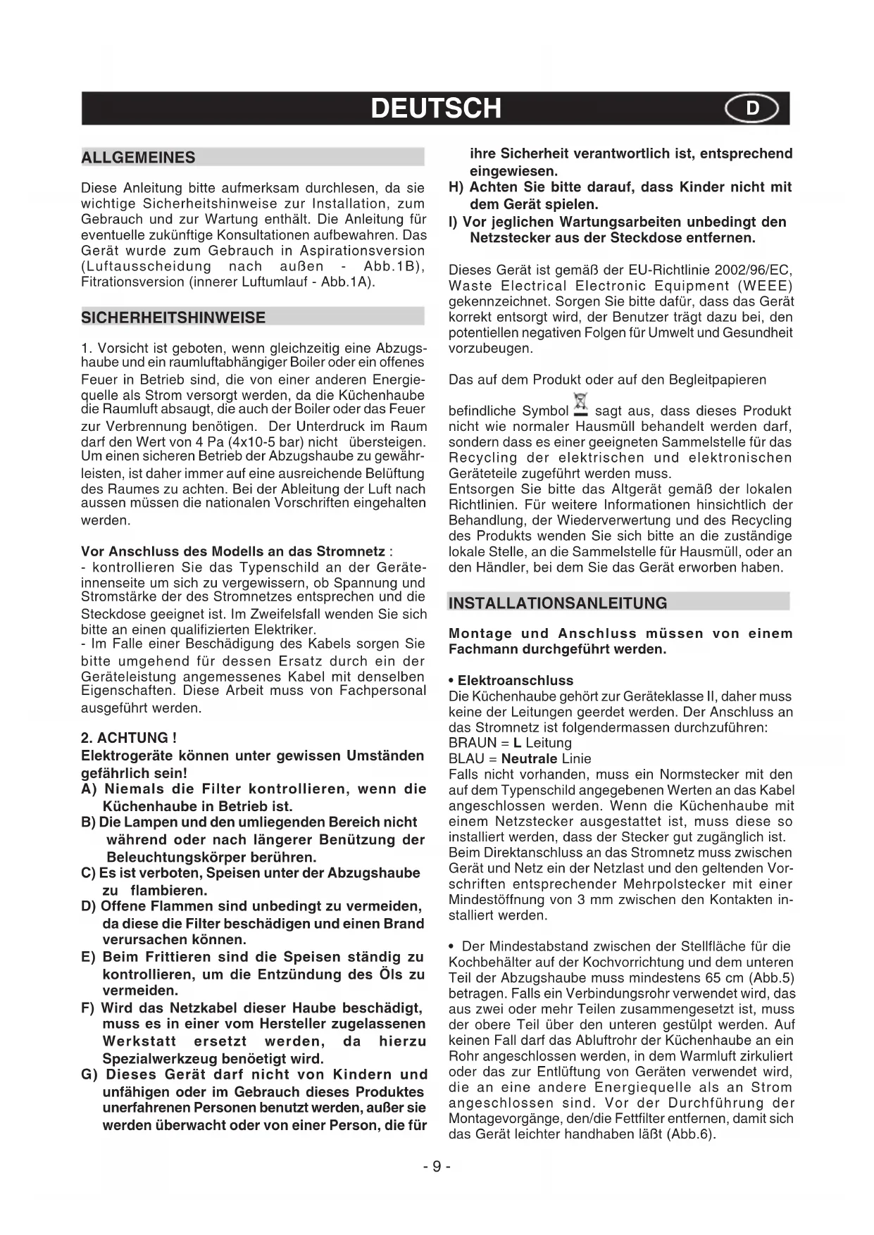 Elektrogeräte können unter gewissen Umständen gefährlich sein! A) Niemals die Filter kontrollieren, wenn die Küchenhaube in Betrieb ist. B) Die Lampen und den umliegenden Bereich nicht während oder nach längerer Benützung der Beleuchtungskörper berühren. C) Es ist verboten, Speisen unter der Abzugshaube zu flambieren. D) Offene Flammen sind unbedingt zu vermeiden, da diese die Filter beschädigen und einen Brand verursachen können. E) Beim Frittieren sind die Speisen ständig zu kontrollieren, um die Entzündung des Öls zu vermeiden. F) Wird das Netzkabel dieser Haube beschädigt, muss es in einer vom Hersteller zugelassenen Werkstatt ersetzt werden, da hierzu Spezialwerkzeug benöetigt wird. G) Dieses Gerät darf nicht von Kindern und unfähigen oder im Gebrauch dieses Produktes unerfahrenen Personen benutzt werden, außer sie werden überwacht oder von einer Person, die für ihre Sicherheit verantwortlich ist, entsprechend eingewiesen. H) Achten Sie bitte darauf, dass Kinder nicht mit dem Gerät spielen.