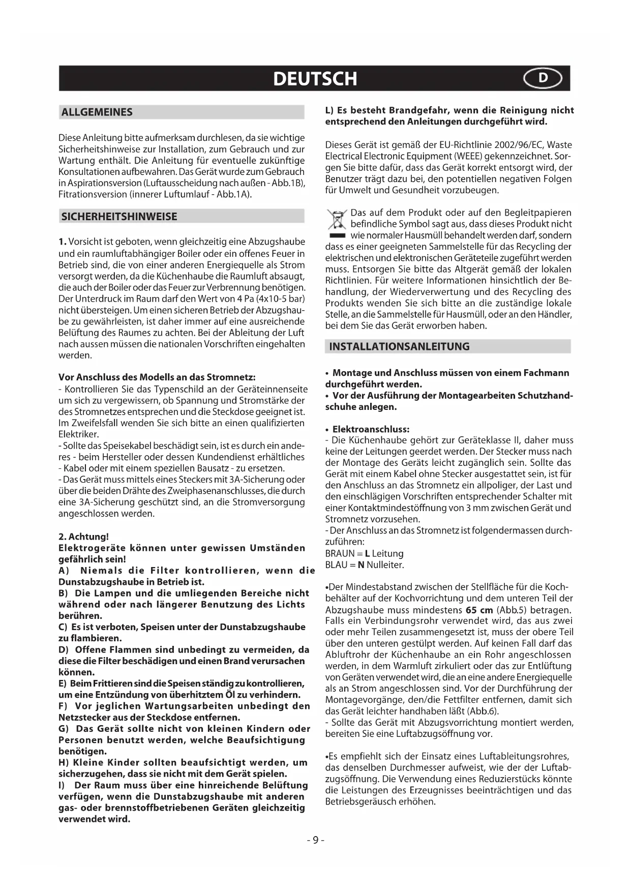 verfügen, wenn die Dunstabzugshaube mit anderen gas- oder brennstoffbetriebenen Geräten gleichzeitig verwendet wird. L) Es besteht Brandgefahr, wenn die Reinigung nicht entsprechend den Anleitungen durchgeführt wird. Dieses Gerät ist gemäß der EU-Richtlinie 2002/96/EC, Waste Electrical Electronic Equipment (WEEE) gekennzeichnet. Sor- gen Sie bitte dafür, dass das Gerät korrekt entsorgt wird, der Benutzer trägt dazu bei, den potentiellen negativen Folgen für Umwelt und Gesundheit vorzubeugen. Das auf dem Produkt oder auf den Begleitpapieren befindliche Symbol sagt aus, dass dieses Produkt nicht wie normaler Hausmüll behandelt werden darf, sondern dass es einer geeigneten Sammelstelle für das Recycling der elektrischen und elektronischen Geräteteile zugeführt werden muss. Entsorgen Sie bitte das Altgerät gemäß der lokalen Richtlinien. Für weitere Informationen hinsichtlich der Be- handlung, der Wiederverwertung und des Recycling des Produkts wenden Sie sich bitte an die zuständige lokale Stelle, an die Sammelstelle für Hausmüll, oder an den Händler, bei dem Sie das Gerät erworben haben. INSTALLATIONSANLEITUNG
