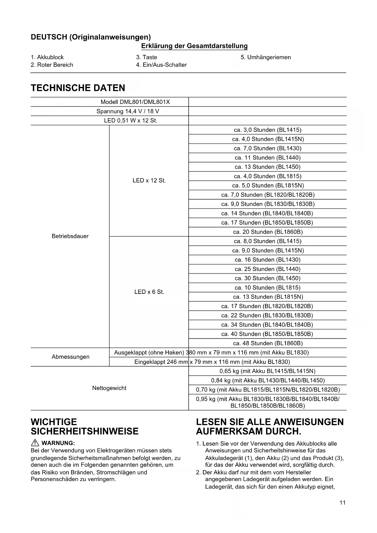 Modell DML801/DML801X Spannung 14,4 V / 18 V LED 0,51 W x 12 St. Betriebsdauer LED x 12 St. ca. 3,0 Stunden (BL1415) ca. 4,0 Stunden (BL1415N) ca. 7,0 Stunden (BL1430) ca. 11 Stunden (BL1440) ca. 13 Stunden (BL1450) ca. 4,0 Stunden (BL1815) ca. 5,0 Stunden (BL1815N) ca. 7,0 Stunden (BL1820/BL1820B) ca. 9,0 Stunden (BL1830/BL1830B) ca. 14 Stunden (BL1840/BL1840B) ca. 17 Stunden (BL1850/BL1850B) ca. 20 Stunden (BL1860B) LED x 6 St. ca. 8,0 Stunden (BL1415) ca. 9,0 Stunden (BL1415N) ca. 16 Stunden (BL1430) ca. 25 Stunden (BL1440) ca. 30 Stunden (BL1450) ca. 10 Stunden (BL1815) ca. 13 Stunden (BL1815N) ca. 17 Stunden (BL1820/BL1820B) ca. 22 Stunden (BL1830/BL1830B) ca. 34 Stunden (BL1840/BL1840B) ca. 40 Stunden (BL1850/BL1850B) ca. 48 Stunden (BL1860B) Abmessungen Ausgeklappt (ohne Haken) 380 mm x 79 mm x 116 mm (mit Akku BL1830) Eingeklappt 246 mm x 79 mm x 116 mm (mit Akku BL1830) Nettogewicht 0,65 kg (mit Akku BL1415/BL1415N) 0,84 kg (mit Akku BL1430/BL1440/BL1450) 0,70 kg (mit Akku BL1815/BL1815N/BL1820/BL1820B) 0,95 kg (mit Akku BL1830/BL1830B/BL1840/BL1840B/ BL1850/BL1850B/BL1860B)12 kann bei der Verwendung mit einem anderen Akku eine Brandgefahr darstellen.