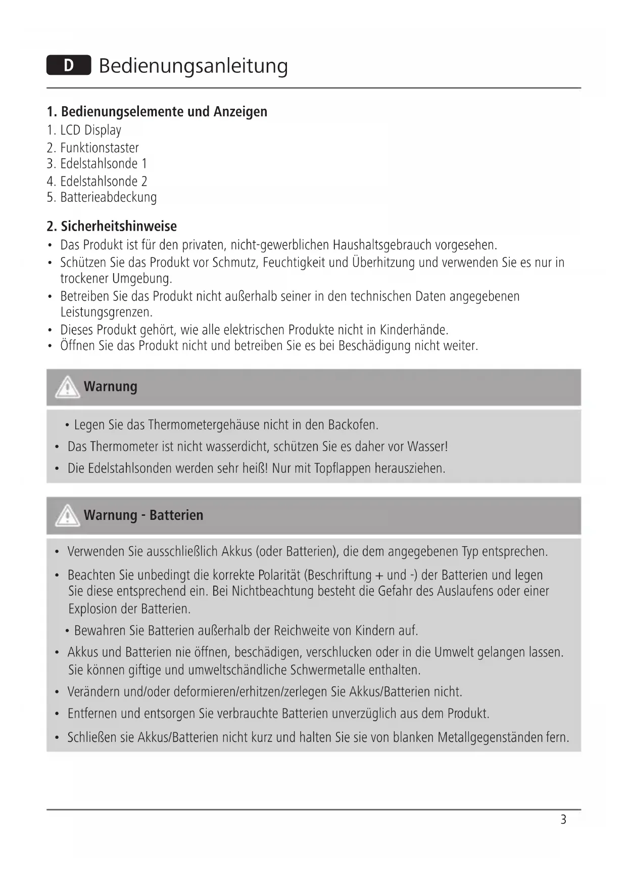 - Die Edelstahlsonden werden sehr heiß! Nur mit Topflappen herausziehen. Warnung - Batterien