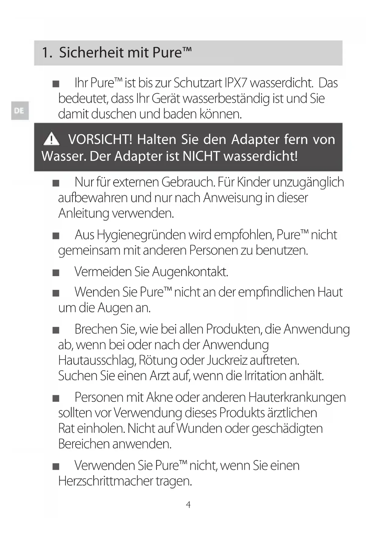 - Bitte lesen Sie das Benutzerhandbuch vor der erste Verwendung von Pure™ genau durch. Achten Sie besonders auf die Verfahren zur Anwendung und den Betrieb des Geräts und auf das Vorgehen nach dem Einsatz. Bitte lesen Sie vor der Anwendung alle Warnungen und Sicherheitsvorkehrungen und folgen Sie diesen strikt bei der Verwendung.