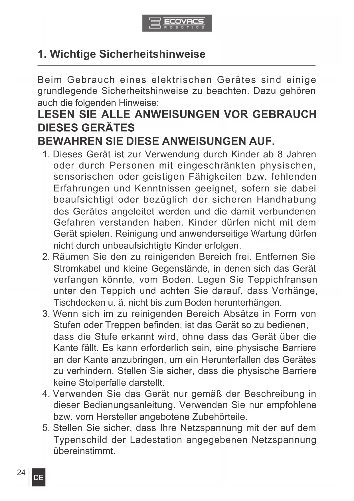 Herzlichen Glückwunsch zum Kauf Ihres neuen DEEBOT von ECOVACS ROBOTICS! Wir hoffen, dass er viele Jahre lang zu Ihrer vollen Zufriedenheit arbeiten wird. Wir sind sicher, dass er Ihnen dabei helfen wird, Ihr Zuhause sauber zu halten, während Sie Ihre wertvolle Zeit für die angenehmen Dinge im Leben nutzen. Live Smart. Enjoy Life. Sollten Sie mit einer Situation konfrontiert sein, die in dieser Bedienungsanleitung nicht ausreichend behandelt wird, wenden Sie sich an das Kundenservicecenter, damit sich ein Techniker mit Ihrem speziellen Problem bzw. Ihrer Frage befassen kann. Weitere Informationen finden Sie auch auf der offiziellen Webseite von ECOVACS ROBOTICS: www.ecovacs.com Technische und gestalterische Änderungen sind im Zuge der kontinuierlichen Produktverbesserung vorbehalten. Vielen Dank, dass Sie sich für den DEEBOT entschieden haben!DE