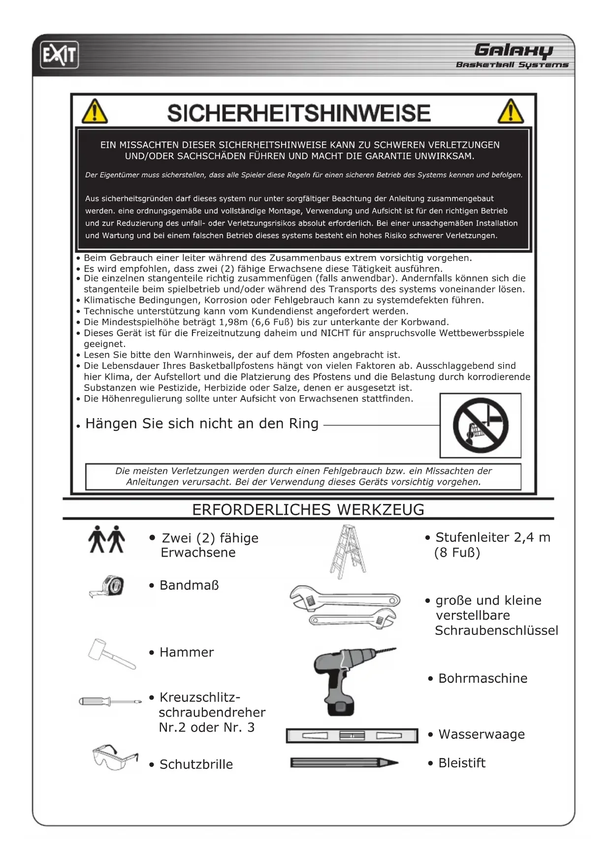 Die klimatischen Bedingungen, Korrosion oder eine unsachgemäß Verwendung konnen zu Schaden am System führen. - Alle EXIT Galaxy-Basketballsysteme, einschließlich jener, die zu Ausstellungszwecken verwendet werden, müssen zusammengebaut gemäß den Anweisungen, um SCHWERE VERLETZUNGEN zu vermeiden.