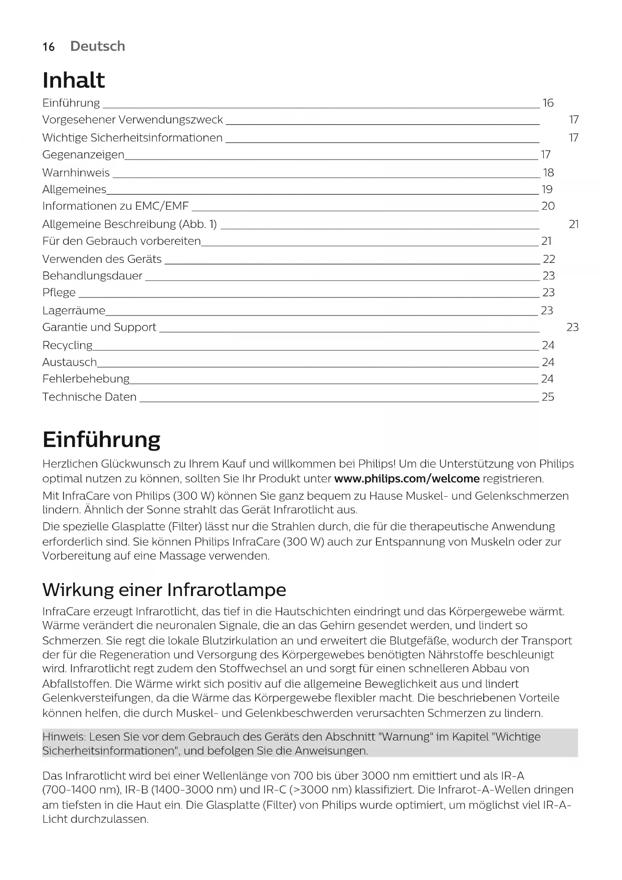 EnglishDeutsch Inhalt Einführung ____________________________________________________________________________________________ 16 Vorgesehener Verwendungszweck __________________________________________________________________ 17 Wichtige Sicherheitsinformationen __________________________________________________________________ 17 Gegenanzeigen_______________________________________________________________________________________ 17 Warnhinweis __________________________________________________________________________________________ 18 Allgemeines___________________________________________________________________________________________ 19 Informationen zu EMC/EMF _________________________________________________________________________ 20 Allgemeine Beschreibung (Abb.1) ___________________________________________________________________ 21 Für den Gebrauch vorbereiten_______________________________________________________________________ 21 Verwenden des Geräts _______________________________________________________________________________ 22 Behandlungsdauer ___________________________________________________________________________________ 23 Pflege _________________________________________________________________________________________________ 23 Lagerräume___________________________________________________________________________________________ 23 Garantie und Support ________________________________________________________________________________ 23 Recycling______________________________________________________________________________________________ 24 Austausch_____________________________________________________________________________________________ 24 Fehlerbehebung______________________________________________________________________________________ 24 Technische Daten ____________________________________________________________________________________ 25 Einführung Herzlichen Glückwunsch zu Ihrem Kauf und willkommen bei Philips! Um die Unterstützung von Philips optimal nutzen zu können, sollten Sie Ihr Produkt unter www.philips.com/welcome registrieren. Mit InfraCare von Philips (300 W) können Sie ganz bequem zu Hause Muskel- und Gelenkschmerzen lindern. Ähnlich der Sonne strahlt das Gerät Infrarotlicht aus. Die spezielle Glasplatte (Filter) lässt nur die Strahlen durch, die für die therapeutische Anwendung erforderlich sind. Sie können Philips InfraCare (300 W) auch zur Entspannung von Muskeln oder zur Vorbereitung auf eine Massage verwenden. Wirkung einer Infrarotlampe InfraCare erzeugt Infrarotlicht, das tief in die Hautschichten eindringt und das Körpergewebe wärmt. Wärme verändert die neuronalen Signale, die an das Gehirn gesendet werden, und lindert so Schmerzen. Sie regt die lokale Blutzirkulation an und erweitert die Blutgefäße, wodurch der Transport der für die Regeneration und Versorgung des Körpergewebes benötigten Nährstoffe beschleunigt wird. Infrarotlicht regt zudem den Stoffwechsel an und sorgt für einen schnelleren Abbau von Abfallstoffen. Die Wärme wirkt sich positiv auf die allgemeine Beweglichkeit aus und lindert Gelenkversteifungen, da die Wärme das Körpergewebe flexibler macht. Die beschriebenen Vorteile können helfen, die durch Muskel- und Gelenkbeschwerden verursachten Schmerzen zu lindern. Hinweis: Lesen Sie vor dem Gebrauch des Geräts den Abschnitt "Warnung" im Kapitel "Wichtige Sicherheitsinformationen", und befolgen Sie die Anweisungen. Das Infrarotlicht wird bei einer Wellenlänge von 700 bis über 3000 nm emittiert und als IR-A (700-1400 nm), IR-B (1400-3000 nm) und IR-C (>3000 nm) klassifiziert. Die Infrarot-A-Wellen dringen am tiefsten in die Haut ein. Die Glasplatte (Filter) von Philips wurde optimiert, um möglichst viel IR-A- Licht durchzulassen.
