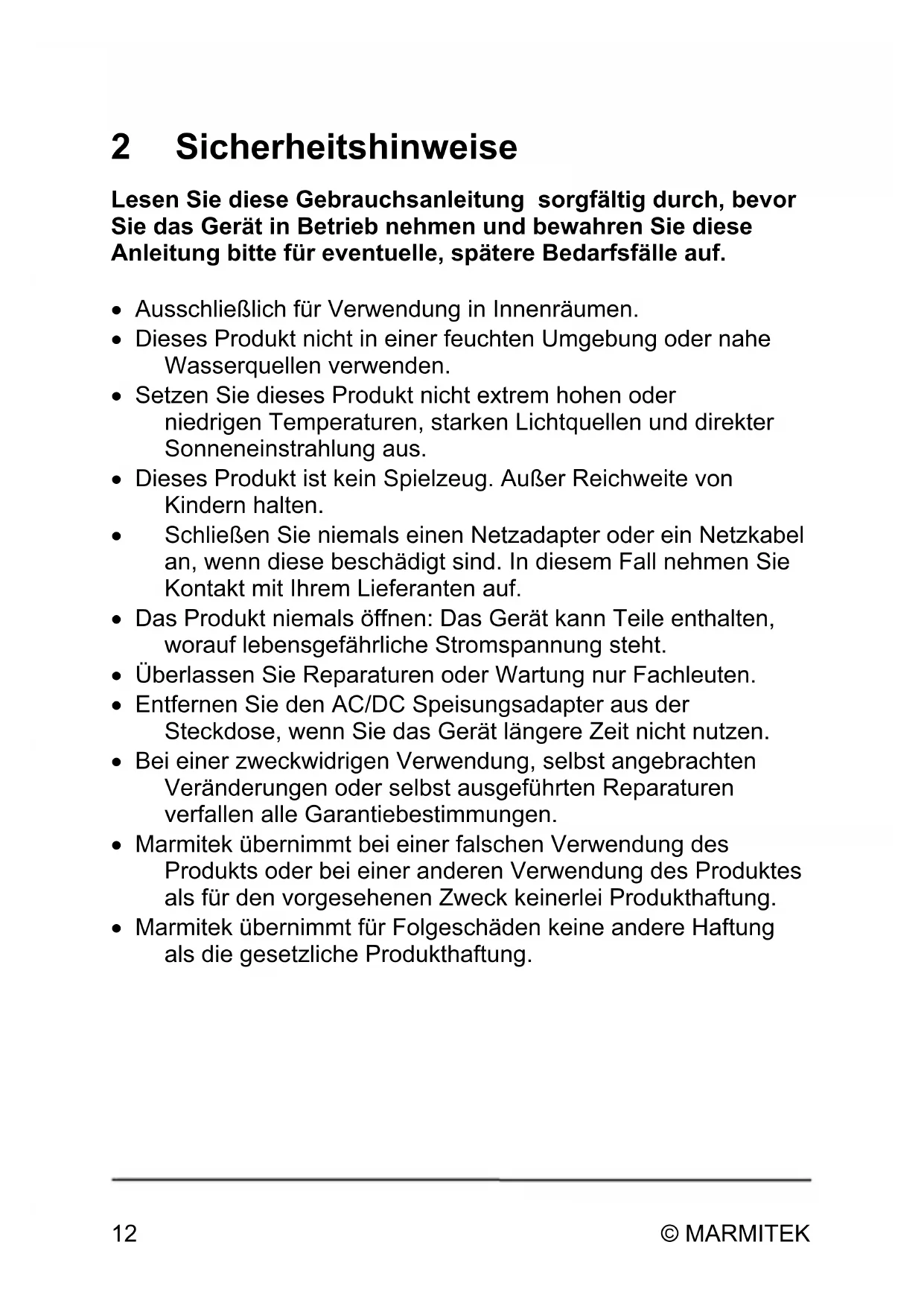 - Marmitek übernimmt bei einer falschen Verwendung des Produkts oder bei einer anderen Verwendung des Produktes als für den vorgesehenen Zweck keinerlei Produktthaftung.