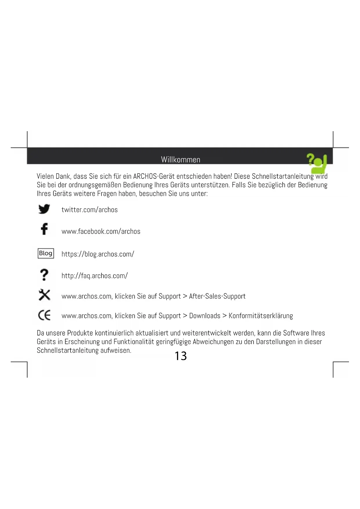 Dépannage13 Vielen Dank, dass Sie sich für ein ARCHOS-Gerät entschieden haben! Diese Schnellstartanleitung wird Sie bei der ordnungsgemäßen Bedienung Ihres Geräts unterstützen. Falls Sie bezüglich der Bedienung Ihres Geräts weitere Fragen haben, besuchen Sie uns unter: twitter.com/archos www.facebook.com/archos Blog https://blog.archos.com/ http://faq.archos.com/ www.archos.com, klicken Sie auf Support > After-Sales-Support www.archos.com, klicken Sie auf Support > Downloads > Konformitätserklärung Da unsere Produkte kontinuierlich aktualisiert und weiterentwickelt werden, kann die Software Ihres Geräts in Erscheinung und Funktionalität geringfügige Abweichungen zu den Darstellungen in dieser Schnellstartanleitung aufweisen. Willkommen14 Warranty Verpackungsinhalt ARCHOS 50F Neon Benutzerhandbuch Garantie, Impressum und Sicherheitshinweise Ladekabel Lade-/Netzgerät15 Beschreibung des Geräts Frontkamera Lautsprecher Kopfhöreranschluss Kamera Bliztlicht EIN/AUS-Taste Lautstärketasten Lautsprecher Micro-USB-Anschluss Lichtsensor MikrofonPicture to show how to remove the bottom casing Remove the battery Picture to show the scards position