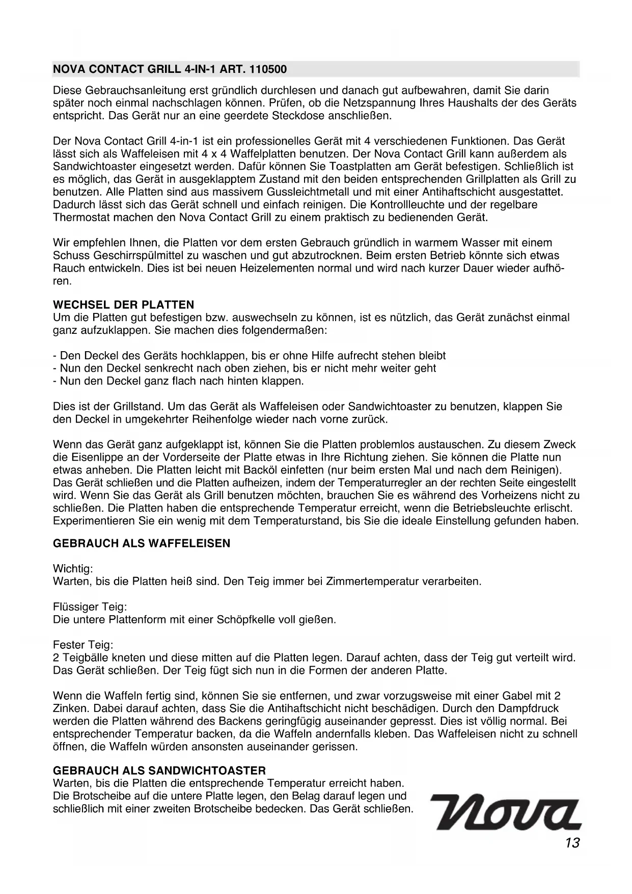 Diese Gebrauchsanleitung erst gründlich durchlesen und danach gut aufbewahren, damit Sie darin später noch einmal nachschlagen können. Prüfen, ob die Netzspannung Ihres Haushalts der des Geräts entspricht. Das Gerät nur an eine geerdete Steckdose anschließen. Der Nova Contact Grill 4-in-1 ist ein professionelles Gerät mit 4 verschiedenen Funktionen. Das Gerät lässt sich als Waffeleisen mit 4 x 4 Waffelplatten benutzen. Der Nova Contact Grill kann außerdem als Sandwichtoaster eingesetzt werden. Dafür können Sie Toastplatten am Gerät befestigen. Schließlich ist es möglich, das Gerät in ausgeklapptem Zustand mit den beiden entsprechenden Grillplatten als Grill zu benutzen. Alle Platten sind aus massivem Gussleichtmetall und mit einer Antihaftschicht ausgestattet. Dadurch lässt sich das Gerät schnell und einfach reinigen. Die Kontrollleuchte und der regelbare Thermostat machen den Nova Contact Grill zu einem praktisch zu bedienenden Gerät. Wir empfehlen Ihnen, die Platten vor dem ersten Gebrauch gründlich in warmem Wasser mit einem Schuss Geschirrspülmittel zu waschen und gut abzutrocknen. Beim ersten Betrieb könnte sich etwas Rauch entwickeln. Dies ist bei neuen Heizelementen normal und wird nach kurzer Dauer wieder aufhö- ren.