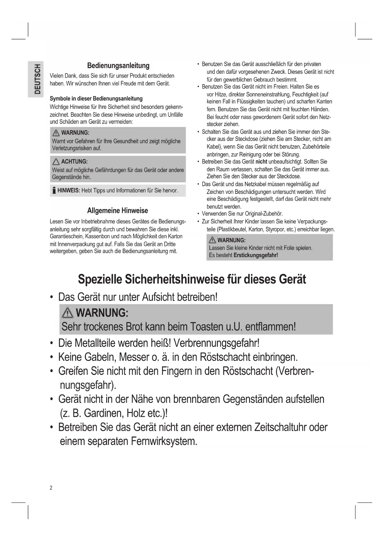 - Das Gerät nur unter Aufsicht betreiben! WARNUNG: Sehr trockenes Brot kann beim Toasten u.U. entammen!