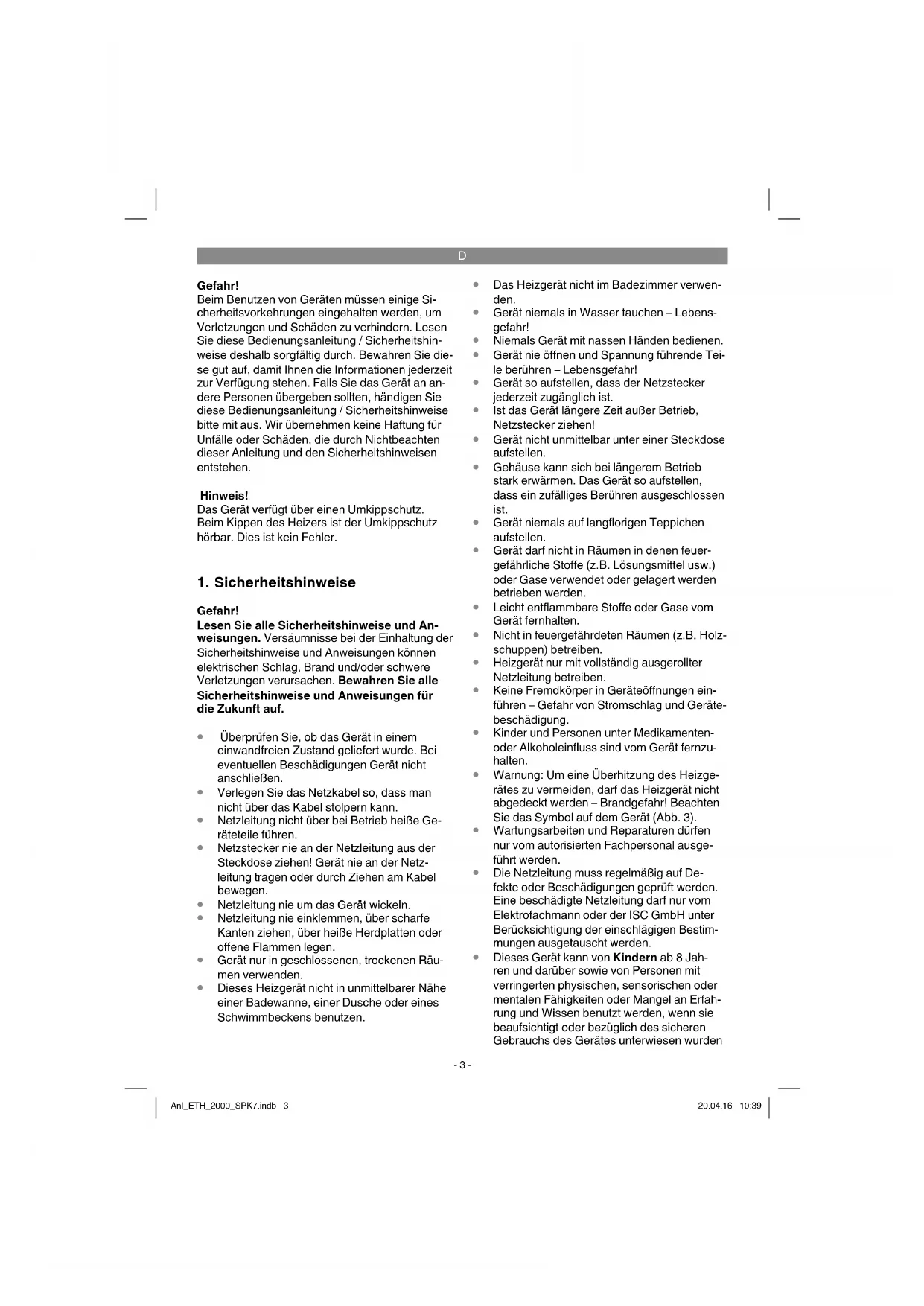 Gefahr! Beim Benutzen von Geräten müssen einige Si- cherheitsvorkehrungen eingehalten werden, um Verletzungen und Schäden zu verhindern. Lesen Sie diese Bedienungsanleitung / Sicherheitshin- weise deshalb sorgfältig durch. Bewahren Sie die- se gut auf, damit Ihnen die Informationen jederzeit zur Verfügung stehen. Falls Sie das Gerät an an- dere Personen übergeben sollten, händigen Sie diese Bedienungsanleitung / Sicherheitshinweise bitte mit aus. Wir übernehmen keine Haftung für Unfälle oder Schäden, die durch Nichtbeachten dieser Anleitung und den Sicherheitshinweisen entstehen. Hinweis! Das Gerät verfügt über einen Umkippschutz. Beim Kippen des Heizers ist der Umkippschutz hörbar. Dies ist kein Fehler.