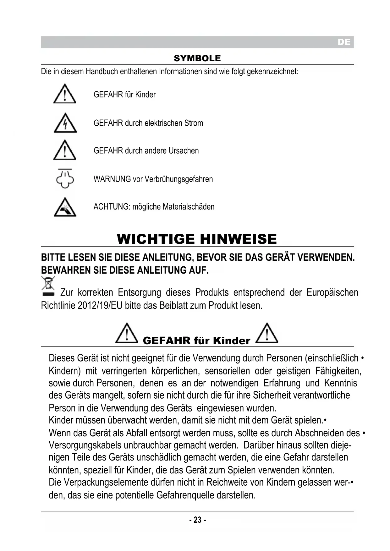 SYMBOLE Die in diesem Handbuch enthaltenen Informationen sind wie folgt gekennzeichnet: GEFAHR für Kinder GEFAHR durch elektrischen Strom GEFAHR durch andere Ursachen WARNUNG vor Verbrühungsgefahren ACHTUNG: mögliche Materialschäden WICHTIGE HINWEISE BITTE LESEN SIE DIESE ANLEITUNG, BEVOR SIE DAS GERÄT VERWENDEN. BEWAHREN SIE DIESE ANLEITUNG AUF. Zur korrekten Entsorgung dieses Produkts entsprechend der Europäischen Richtlinie 2012/19/EU bitte das Beiblatt zum Produkt lesen. GEFAHR für Kinder Dieses Gerät ist nicht geeignet für die Verwendung durch Personen (einschließlich • Kindern) mit verringerten körperlichen, sensoriellen oder geistigen Fähigkeiten, sowie durch Personen, denen es an der notwendigen Erfahrung und Kenntnis des Geräts mangelt, sofern sie nicht durch die für ihre Sicherheit verantwortliche Person in die Verwendung des Geräts eingewiesen wurden. Kinder müssen überwacht werden, damit sie nicht mit dem Gerät spielen.• Wenn das Gerät als Abfall entsorgt werden muss, sollte es durch Abschneiden des • Versorgungskabels unbrauchbar gemacht werden. Darüber hinaus sollten dieje- nigen Teile des Geräts unschädlich gemacht werden, die eine Gefahr darstellen könnten, speziell für Kinder, die das Gerät zum Spielen verwenden könnten. Die Verpackungselemente dürfen nicht in Reichweite von Kindern gelassen wer-• den, das sie eine potentielle Gefahrenquelle darstellen.- 24 -