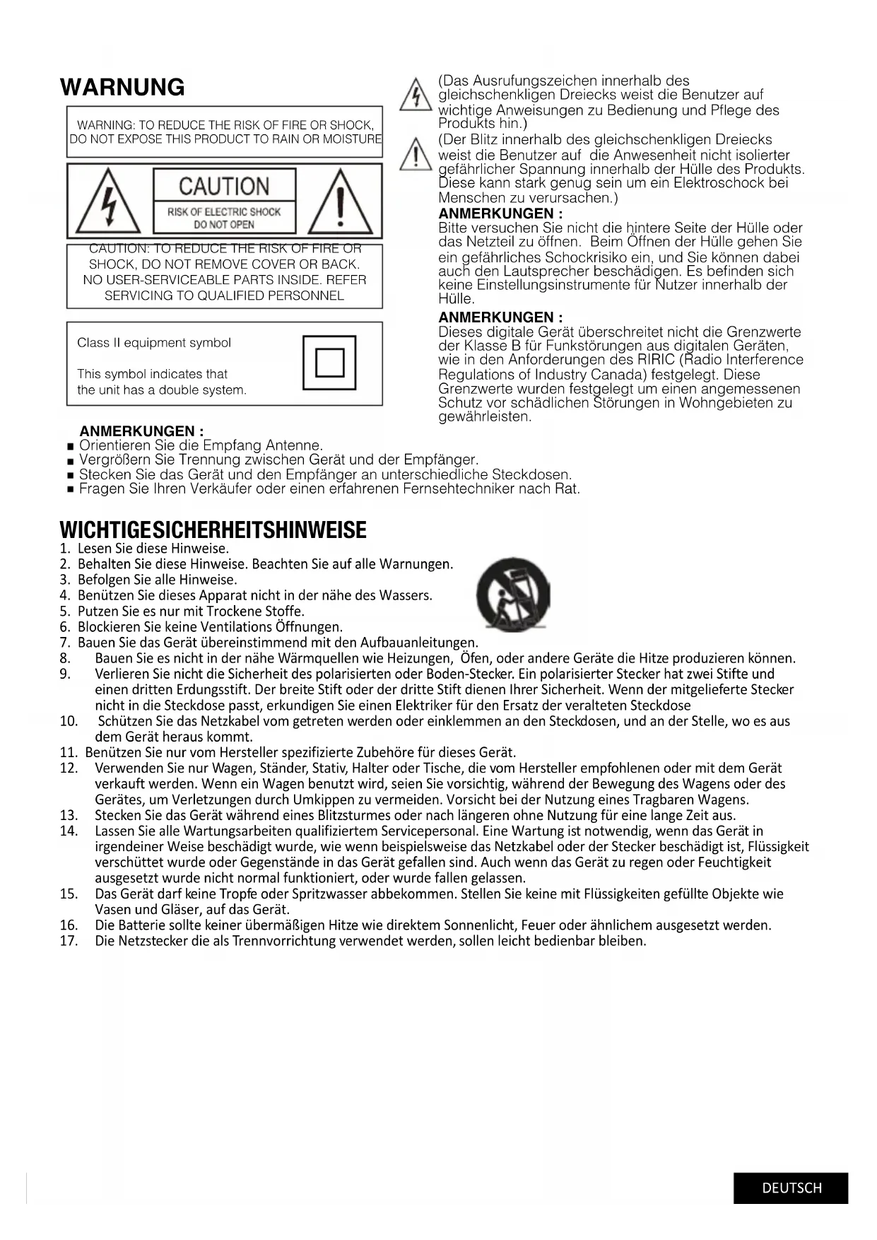 - Verwenden Sie nur Wagen, Ständer, Stativ, Halter oder Tische, die vom Hersteller empfohlenen oder mit dem Gerät verkauft werden. Wenn ein Wagen benutzt wird, seien Sie vorsichtig, während der Bewegung des Wagens oder des Gerätes, um Verletzungen durch Umkippen zu vermeiden. Vorsicht bei der Nutzung eines Tragbaren Wagens.