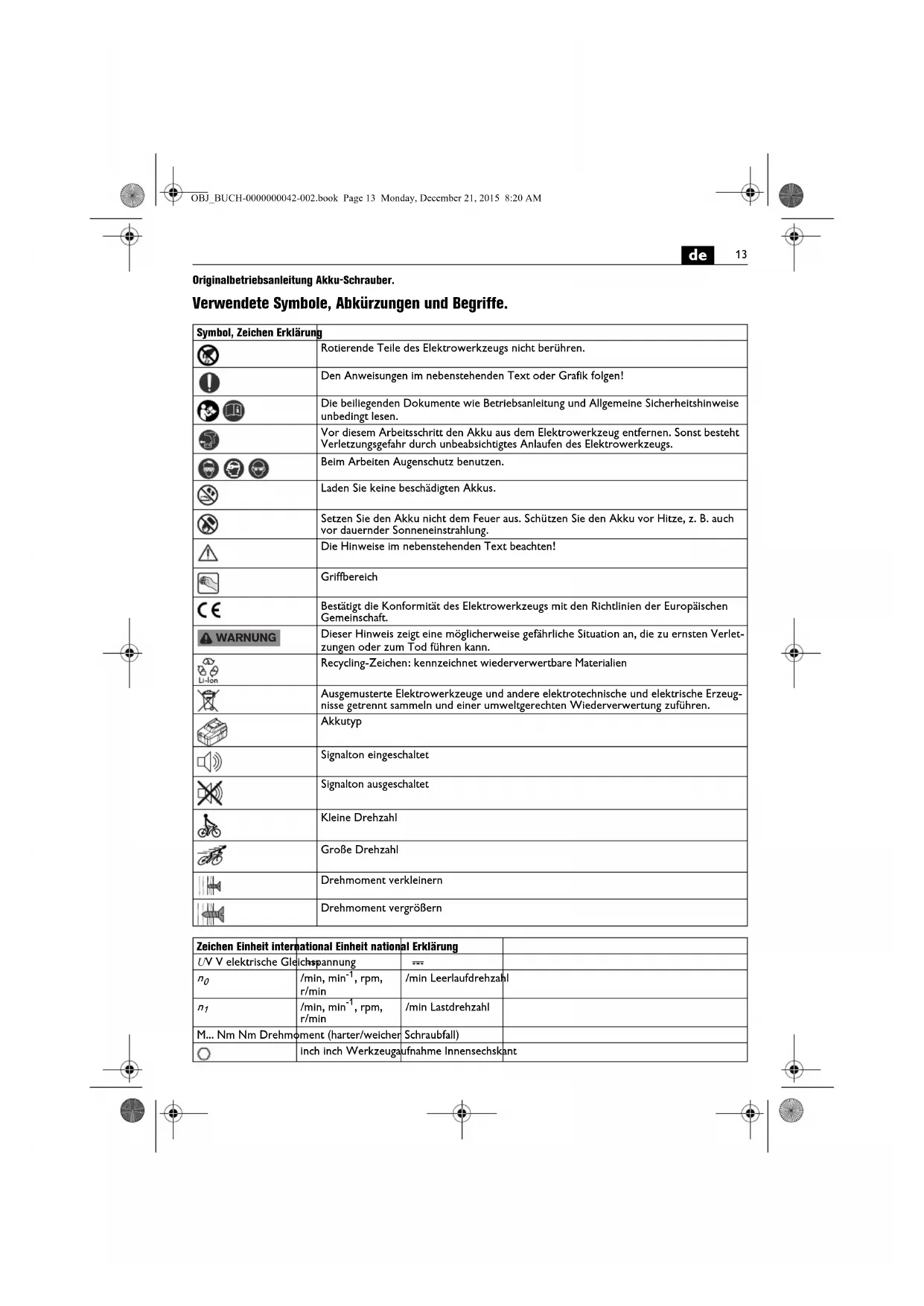 Originalbetriebsanleitung Akku-Schrauber. Verwendete Symbole, Abkürzungen und Begriffe. Symbol, Zeichen Erklärung Rotierende Teile des Elektrowerkzeugs nicht berühren. Den Anweisungen im nebenstehenden Text oder Grafik folgen! Die beiliegenden Dokumente wie Betriebsanleitung und Allgemeine Sicherheitshinweise unbedingt lesen. Vor diesem Arbeitsschritt den Akku aus dem Elektrowerkzeug entfernen. Sonst besteht Verletzungsgefahr durch unbeabsichtigtes Anlaufen des Elektrowerkzeugs. Beim Arbeiten Augenschutz benutzen. Laden Sie keine beschädigten Akkus. Setzen Sie den Akku nicht dem Feuer aus. Schützen Sie den Akku vor Hitze, z. B. auch vor dauernder Sonneneinstrahlung. Die Hinweise im nebenstehenden Text beachten! Griffbereich Bestätigt die Konformität des Elektrowerkzeugs mit den Richtlinien der Europäischen Gemeinschaft. Dieser Hinweis zeigt eine möglicherweise gefährliche Situation an, die zu ernsten Verlet- zungen oder zum Tod führen kann. Recycling-Zeichen: kennzeichnet wiederverwertbare Materialien Ausgemusterte Elektrowerkzeuge und andere elektrotechnische und elektrische Erzeug- nisse getrennt sammeln und einer umweltgerechten Wiederverwertung zuführen. Akkutyp Signalton eingeschaltet Signalton ausgeschaltet Kleine Drehzahl Große Drehzahl Drehmoment verkleinern Drehmoment vergrößern Zeichen Einheit international Einheit national Erklärung U V V elektrische Gleichspannung