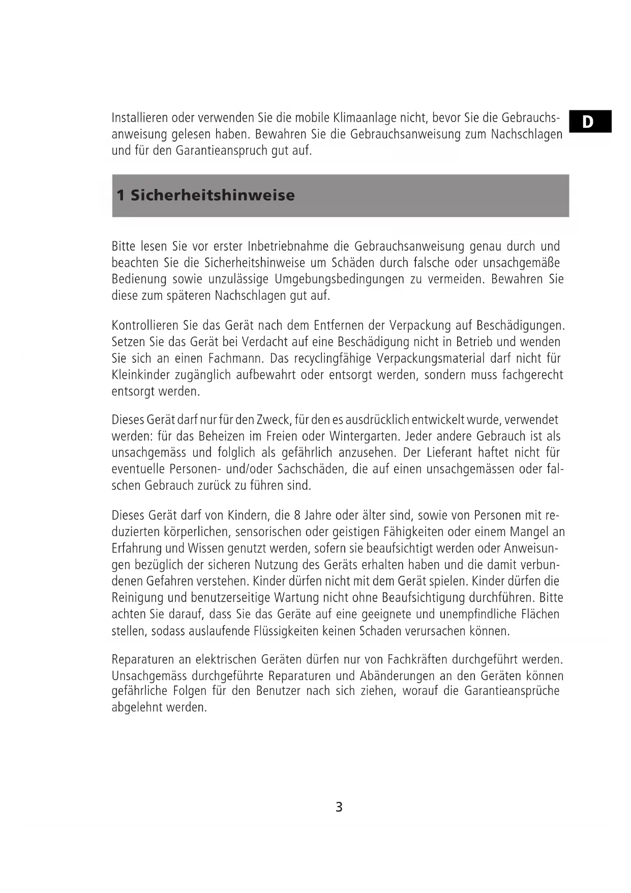 Installieren oder verwenden Sie die mobile Klimaanlage nicht, bevor Sie die Gebrauchs- anweisung gelesen haben. Bewahren Sie die Gebrauchsanweisung zum Nachschlagen und für den Garantieanspruch gut auf.4