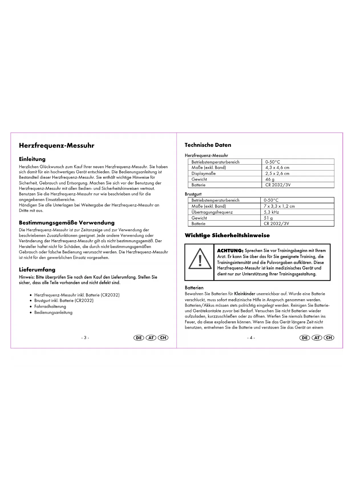 ACHTUNG: Sprechen Sie vor Trainingsbeginn mit Ihrem Arzt. Er kann Sie über das für Sie geeignete Training, die Trainingsintensität und die Pulsvorgaben aufklären. Diese Herzfrequenz-Messuhr ist kein medizinisches Gerät und dient nur zur Unterstützung Ihrer Trainingsgestaltung. Batterien Bewahren Sie Batterien für Kleinkinder unerreichbar auf. Wurde eine Batterie verschluckt, muss sofort medizinische Hilfe in Anspruch genommen werden. Batterien/Akkus müssen stets polrichtig eingelegt werden. Reinigen Sie Batterie- und Gerätekontakte zuvor bei Bedarf. Versuchen Sie nicht Batterien wieder aufzuladen, kurzzuschließen oder zu öffnen. Werfen Sie niemals Batterien ins Feuer, da diese explodieren können. Wenn Sie das Gerät längere Zeit nicht benutzen, entnehmen Sie die Batterie und verstauen Sie das Gerät an einem- 5 - trockenen und staubfreien Ort. Bei unsachgemäßem Gebrauch der Batterie besteht Explosions- und Auslaufgefahr. Sollte die Batterie doch einmal ausgelaufen sein, vermeiden Sie Kontakt mit Haut, Augen und Schleimhäuten. Benutzen Sie Handschuhe. Bei Kontakt mit Batteriesäure die betroffenen Stellen mit reichlich klarem Wasser spülen und umgehend einen Arzt aufsuchen. Entfernen Sie erschöpfte Batterien umgehend aus dem Gerät, es besteht erhöhte Auslaufgefahr. Benutzer Dieses Gerät kann von Personen (einschließlich Kindern ab 8 Jahren) mit verringerten physischen, sensorischen oder mentalen Fähigkeiten oder Mangel an Erfahrung und Wissen benutzt werden, wenn sie beaufsichtigt oder bezüglich des sicheren Gebrauchs des Geräts unterwiesen wurden und die daraus resultierenden Gefahren verstehen. Kinder dürfen nicht mit dem Gerät spielen. Reinigung und Benutzer-Wartung dürfen nicht von Kindern ohne Beaufsichtigung durchgeführt werden. Halten Sie auch die Verpackungsfolien von Kindern fern. Es besteht Erstickungsgefahr.