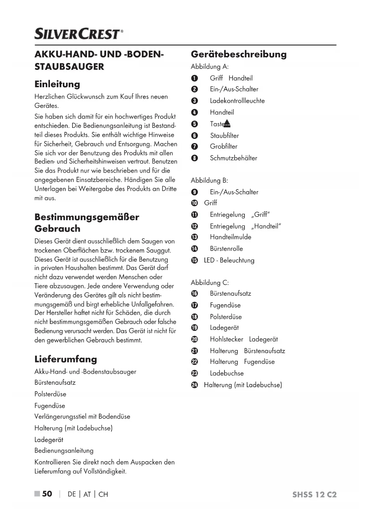 STAUBSAUGER Einleitung Herzlichen Glückwunsch zum Kauf Ihres neuen Gerätes. Sie haben sich damit für ein hochwertiges Produkt entschieden. Die Bedienungsanleitung ist Bestand- teil dieses Produkts. Sie enthält wichtige Hinweise für Sicherheit, Gebrauch und Entsorgung. Machen Sie sich vor der Benutzung des Produkts mit allen Bedien- und Sicherheitshinweisen vertraut. Benutzen Sie das Produkt nur wie beschrieben und für die angegebenen Einsatzbereiche. Händigen Sie alle Unterlagen bei Weitergabe des Produkts an Dritte mit aus. Bestimmungsgemäßer Gebrauch Dieses Gerät dient ausschließlich dem Saugen von trockenen Oberflächen bzw. trockenem Sauggut. Dieses Gerät ist ausschließlich für die Benutzung in privaten Haushalten bestimmt. Das Gerät darf nicht dazu verwendet werden Menschen oder Tiere abzusaugen. Jede andere Verwendung oder Veränderung des Gerätes gilt als nicht bestim- mungsgemäß und birgt erhebliche Unfallgefahren. Der Hersteller haftet nicht für Schäden, die durch nicht bestimmungsgemäßen Gebrauch oder falsche Bedienung verursacht werden. Das Gerät ist nicht für den gewerblichen Gebrauch bestimmt. Lieferumfang Akku-Hand- und -Bodenstaubsauger Bürstenaufsatz Polsterdüse Fugendüse Verlängerungsstiel mit Bodendüse Halterung (mit Ladebuchse) Ladegerät Bedienungsanleitung Kontrollieren Sie direkt nach dem Auspacken den Lieferumfang auf Vollständigkeit. Gerätebeschreibung Abbildung A: Griff Handteil Ein-/Aus-Schalter Ladekontrollleuchte Handteil Tasten Staubfilter Grobfilter Schmutzbehälter Abbildung B: Ein-/Aus-Schalter Griff - Entriegelung „Griff“ 3 Entriegelung „Handteil“ ! Handteilmulde . Bürstenrolle 0 LED - Beleuchtung Abbildung C: 6 Bürstenaufsatz 1 Fugendüse % Polsterdüse + Ladegerät , Hohlstecker Ladegerät Halterung Bürstenaufsatz / Halterung Fugendüse Ladebuchse " Halterung (mit Ladebuchse)SHSS 12 C2