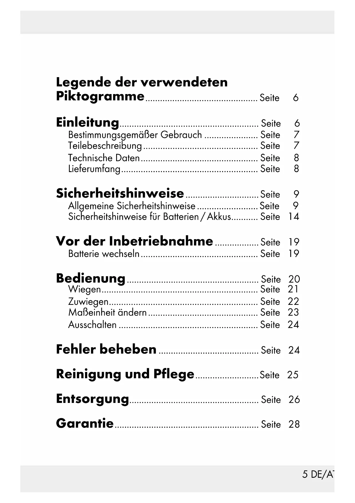 5 65 DE/AT/CH Legende der verwendeten Piktogramme .............................................. Seite 6 Einleitung ......................................................... Seite 6 Bestimmungsgemäßer Gebrauch ...................... Seite 7 Teilebeschreibung ............................................... Seite 7 Technische Daten ................................................ Seite 8 Lieferumfang ........................................................ Seite 8 Sicherheitshinweise .............................. Seite 9 Allgemeine Sicherheitshinweise ......................... Seite 9 Sicherheitshinweise für Batterien / Akkus ........... Seite 14 Vor der Inbetriebnahme .................. Seite 19 Batterie wechseln ................................................ Seite 19 Bedienung ...................................................... Seite 20 Wiegen ................................................................ Seite 21 Zuwiegen ............................................................. Seite 22 Maßeinheit ändern ............................................. Seite 23 Ausschalten ......................................................... Seite 24 Fehler beheben ......................................... Seite 24 Reinigung und Pflege .......................... Seite 25 Entsorgung..................................................... Seite 26 Garantie ........................................................... Seite 286 DE/AT/CH Legende der verwendeten Piktogramme Gleichstrom Öffnungsrichtung der Batteriefachabdeckung Küchenwaage Einleitung Wir beglückwünschen Sie zum Kauf Ihres neuen Produkts. Sie ha- ben sich damit für ein hochwertiges Produkt entschieden. Die Bedienungsanleitung ist Teil dieses Produkts. Sie enthält wichtige Hinweise für Sicherheit, Gebrauch und Entsor- gung. Machen Sie sich vor der Benutzung des Produkts mit allen Bedien- und Sicherheitshin- weisen vertraut. Benutzen Sie das Produkt nur wie beschrieben und für die angegebenen Ein- satzbereiche. Händigen Sie alle Unterlagen bei Weitergabe des Produkts an Dritte mit aus.7 DE/AT/CH Bestimmungsgemäßer Gebrauch Das Produkt ist zum Wiegen und Zuwiegen haushaltsüblicher Mengen von Lebensmitteln bestimmt. Das Produkt ist nicht dazu bestimmt, mit Lebensmitteln in Berührung zu kommen. Das Produkt ist ausschließlich für die Benut- zung in privaten Haushalten bestimmt und darf nicht in medizinischen oder kommerziellen Bereichen verwendet werden. Der Hersteller haftet nicht für Schäden, die durch unsachge- mäßen Gebrauch entstehen. Teilebeschreibung Küchenwaage (Abb. A+B):