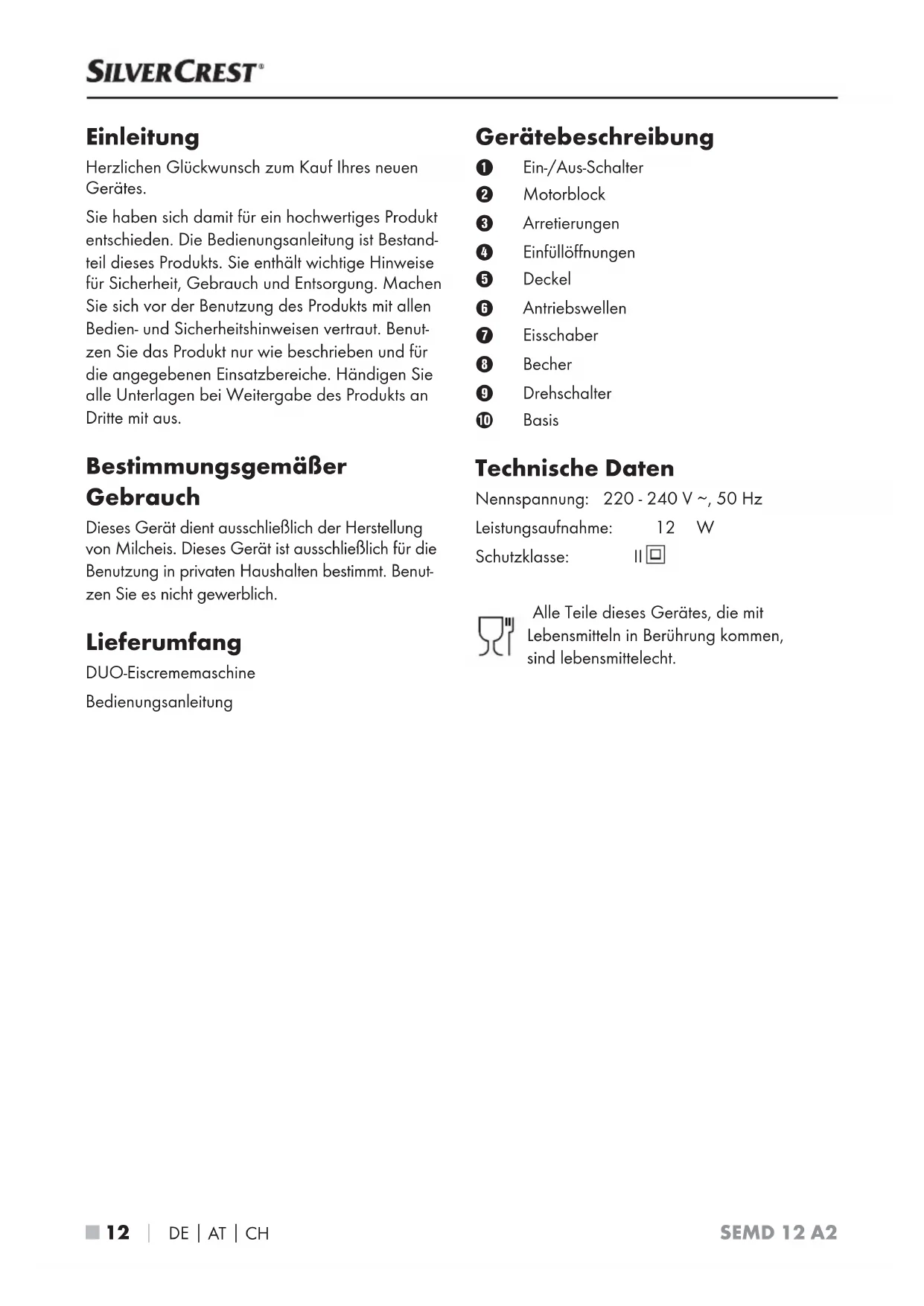 Einleitung Herzlichen Glückwunsch zum Kauf Ihres neuen Gerätes. Sie haben sich damit für ein hochwertiges Produkt entschieden. Die Bedienungsanleitung ist Bestand- teil dieses Produkts. Sie enthält wichtige Hinweise für Sicherheit, Gebrauch und Entsorgung. Machen Sie sich vor der Benutzung des Produkts mit allen Bedien- und Sicherheitshinweisen vertraut. Benut- zen Sie das Produkt nur wie beschrieben und für die angegebenen Einsatzbereiche. Händigen Sie alle Unterlagen bei Weitergabe des Produkts an Dritte mit aus. Bestimmungsgemäßer Gebrauch Dieses Gerät dient ausschließlich der Herstellung von Milcheis. Dieses Gerät ist ausschließlich für die Benutzung in privaten Haushalten bestimmt. Benut- zen Sie es nicht gewerblich. Lieferumfang DUO-Eiscrememaschine Bedienungsanleitung Gerätebeschreibung Ein-/Aus-Schalter Motorblock Arretierungen Einfüllöffnungen Deckel Antriebswellen Eisschaber Becher Drehschalter Basis Technische Daten Nennspannung: 220 - 240 V ∼, 50 Hz Leistungsaufnahme: 12 W Schutzklasse: II Alle Teile dieses Gerätes, die mit Lebensmitteln in Berührung kommen, sind lebensmittelecht.SEMD 12 A2