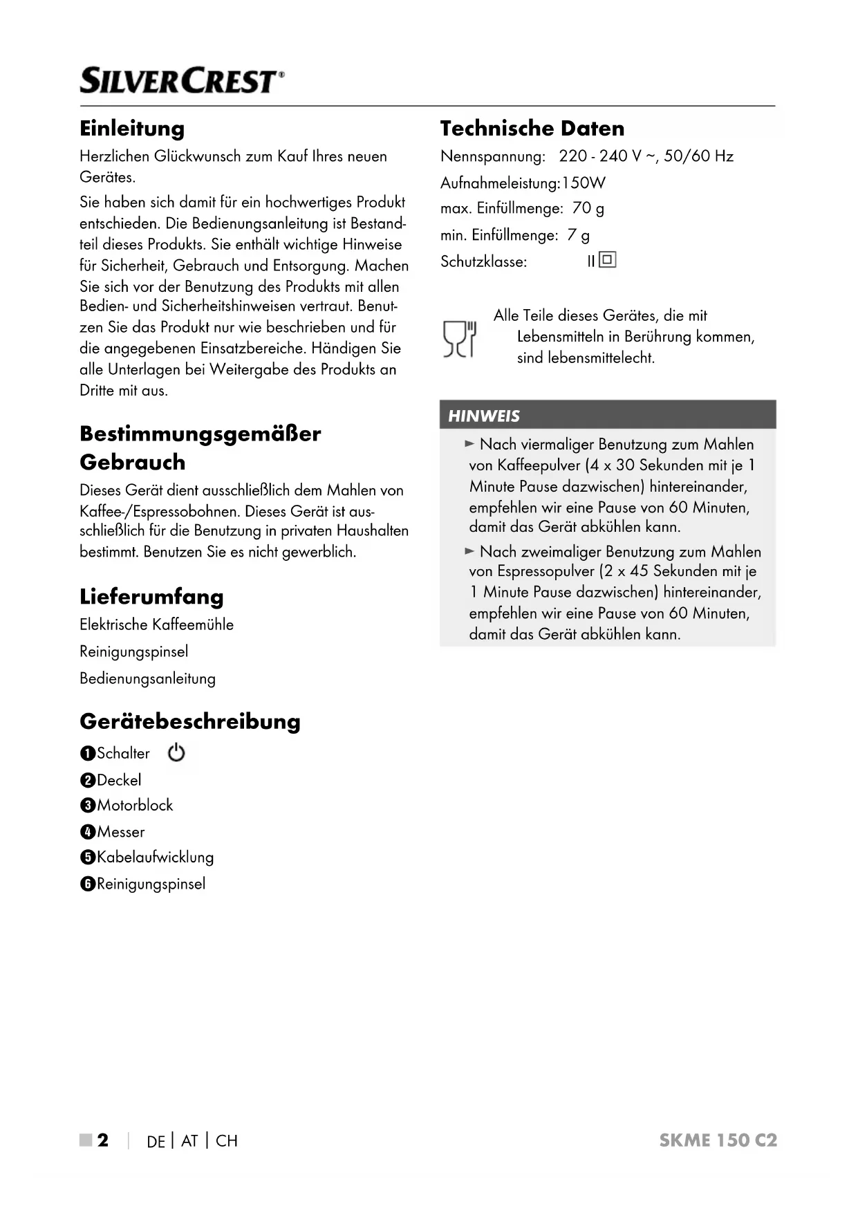 SKME 150 C2 - Kaffeemühle SILVERCREST - Kostenlose Bedienungsanleitung