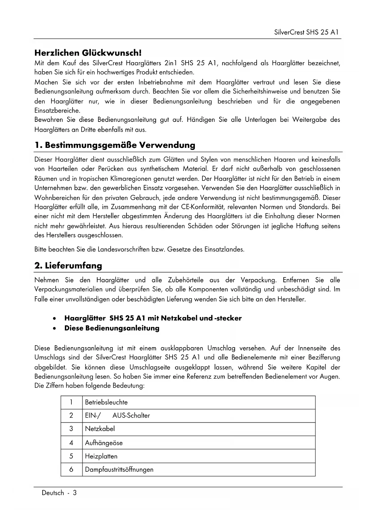 Nehmen Sie den Haarglätter und alle Zubehörteile aus der Verpackung. Entfernen Sie alle Verpackungsmaterialien und überprüfen Sie, ob alle Komponenten vollständig und unbeschädigt sind. Im Falle einer unvollständigen oder beschädigten Lieferung wenden Sie sich bitte an den Hersteller. Haarglätter SHS 25 A1 mit Netzkabel und -stecker Diese Bedienungsanleitung Diese Bedienungsanleitung ist mit einem ausklappbaren Umschlag versehen. Auf der Innenseite des Umschlags sind der SilverCrest Haarglätter SHS 25 A1 und alle Bedienelemente mit einer Bezifferung abgebildet. Sie können diese Umschlagseite ausgeklappt lassen, während Sie weitere Kapitel der Bedienungsanleitung lesen. So haben Sie immer eine Referenz zum betreffenden Bedienelement vor Augen. Die Ziffern haben folgende Bedeutung: 1 Betriebsleuchte 2 EIN-/ AUS-Schalter 3 Netzkabel 4 Aufhängeöse 5 Heizplatten 6 DampfaustrittsöffnungenSilverCrest SHS 25 A1