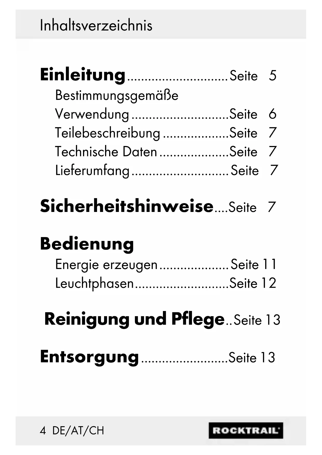 Bestimmungsgemäße Verwendung Das Produkt ist als kleine, mobile Lichtquelle mit eigener Energieversorgung durch eine Dynamokurbel vorgesehen. Das Produkt ist zur Anwendung im Innen- und Außenbe- reich bestimmt. Eine andere Verwendung als zuvor beschrieben oder eine Verände- rung des Produkts ist nicht zulässig und kann zu Verletzungen und / oder Beschä- digungen des Produkts führen. Für aus bestimmungswidriger Verwendung entstan- dene Schäden übernimmt der Hersteller keine Haftung. Das Produkt ist nicht für den gewerblichen Einsatz bestimmt.7 DE/AT/CH Einleitung / Sicherheitshinweise