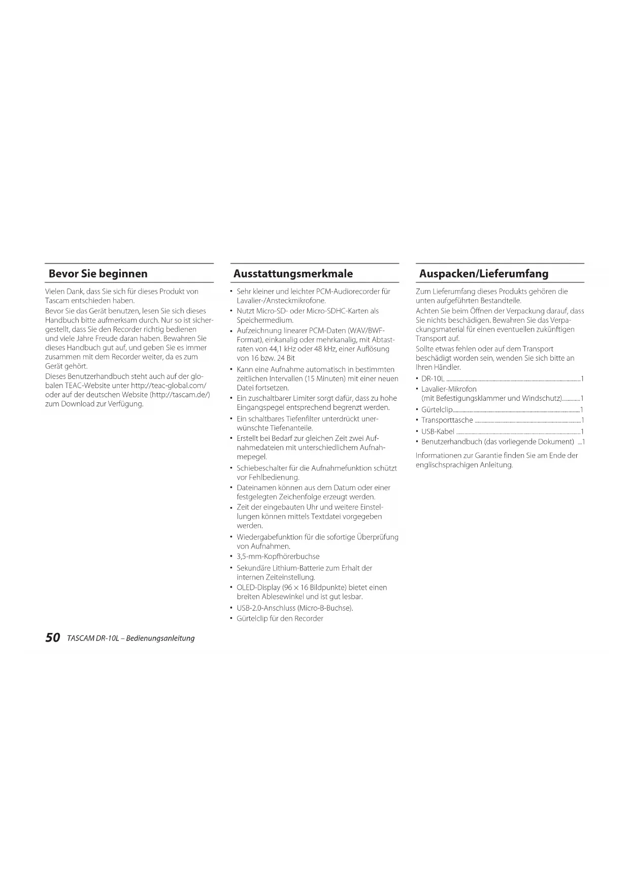 Benutzerhandbuch (das vorliegende Dokument) ...1 Informationen zur Garantie finden Sie am Ende der englischsprachigen Anleitung.TASCAM DR-10L – Bedienungsanleitung