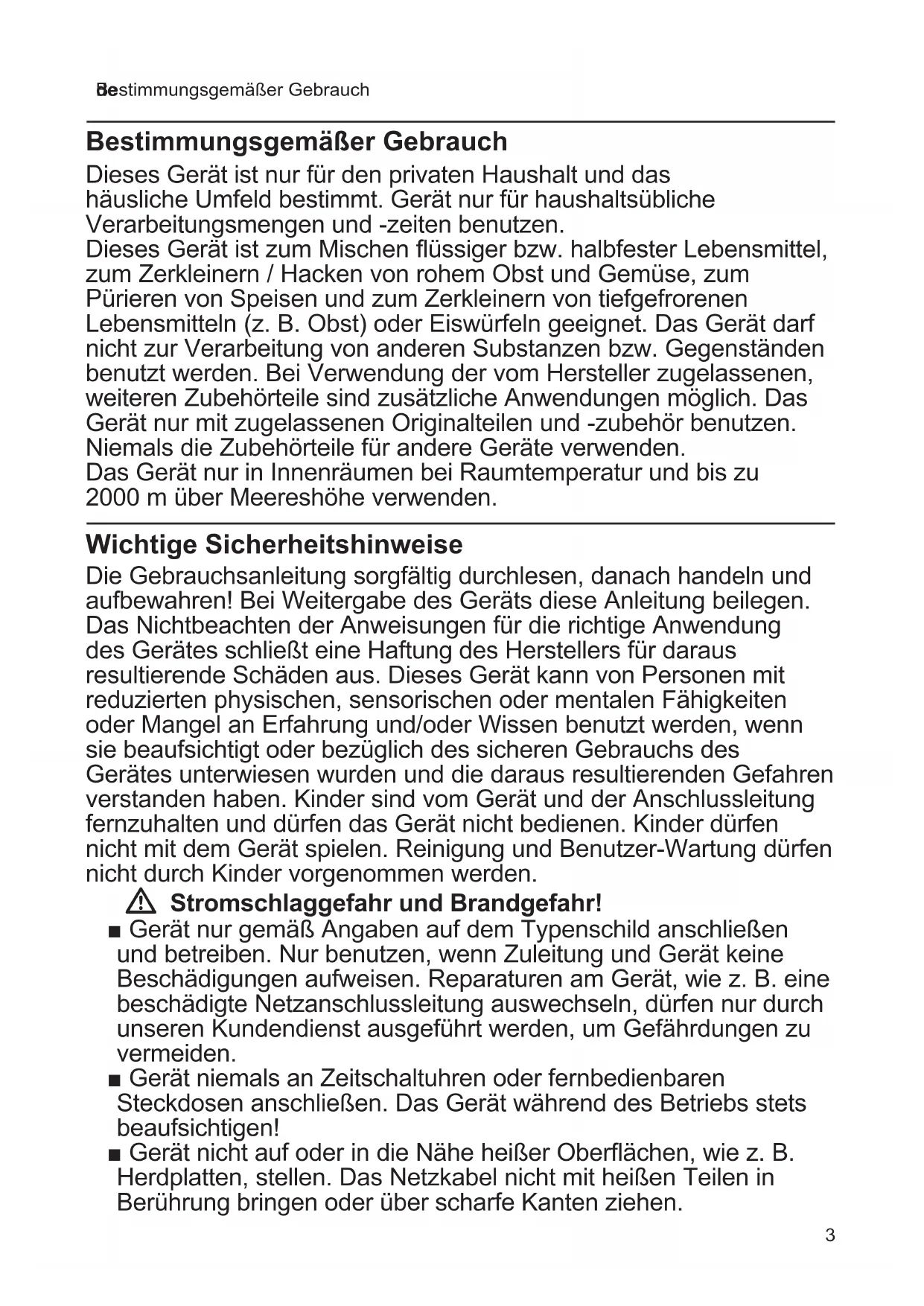 Bestimmungsgemäßer Gebrauch Bestimmungsgemäßer Gebrauch Dieses Gerät ist nur für den privaten Haushalt und das häusliche Umfeld bestimmt. Gerät nur für haushaltsübliche Verarbeitungsmengen und -zeiten benutzen. Dieses Gerät ist zum Mischen üssiger bzw. halbfester Lebensmittel, zum Zerkleinern / Hacken von rohem Obst und Gemüse, zum Pürieren von Speisen und zum Zerkleinern von tiefgefrorenen Lebensmitteln (z. B. Obst) oder Eiswürfeln geeignet. Das Gerät darf nicht zur Verarbeitung von anderen Substanzen bzw. Gegenständen benutzt werden. Bei Verwendung der vom Hersteller zugelassenen, weiteren Zubehörteile sind zusätzliche Anwendungen möglich. Das Gerät nur mit zugelassenen Originalteilen und -zubehör benutzen. Niemals die Zubehörteile für andere Geräte verwenden. Das Gerät nur in Innenräumen bei Raumtemperatur und bis zu 2000 m über Meereshöhe verwenden. Wichtige Sicherheitshinweise Die Gebrauchsanleitung sorgfältig durchlesen, danach handeln und aufbewahren! Bei Weitergabe des Geräts diese Anleitung beilegen. Das Nichtbeachten der Anweisungen für die richtige Anwendung des Gerätes schließt eine Haftung des Herstellers für daraus resultierende Schäden aus. Dieses Gerät kann von Personen mit reduzierten physischen, sensorischen oder mentalen Fähigkeiten oder Mangel an Erfahrung und/oder Wissen benutzt werden, wenn sie beaufsichtigt oder bezüglich des sicheren Gebrauchs des Gerätes unterwiesen wurden und die daraus resultierenden Gefahren verstanden haben. Kinder sind vom Gerät und der Anschlussleitung fernzuhalten und dürfen das Gerät nicht bedienen. Kinder dürfen nicht mit dem Gerät spielen. Reinigung und Benutzer-Wartung dürfen nicht durch Kinder vorgenommen werden. W Stromschlaggefahr und Brandgefahr! ■ Gerät nur gemäß Angaben auf dem Typenschild anschließen und betreiben. Nur benutzen, wenn Zuleitung und Gerät keine Beschädigungen aufweisen. Reparaturen am Gerät, wie z. B. eine beschädigte Netzanschlussleitung auswechseln, dürfen nur durch unseren Kundendienst ausgeführt werden, um Gefährdungen zu vermeiden. ■ Gerät niemals an Zeitschaltuhren oder fernbedienbaren Steckdosen anschließen. Das Gerät während des Betriebs stets beaufsichtigen! ■ Gerät nicht auf oder in die Nähe heißer Oberächen, wie z. B. Herdplatten, stellen. Das Netzkabel nicht mit heißen Teilen in Berührung bringen oder über scharfe Kanten ziehen.4 de Wichtige Sicherheitshinweise ■ Das Grundgerät niemals in Wasser tauchen oder in den Geschirrspüler geben. Keinen Dampfreiniger benutzen. Das Gerät nicht mit feuchten Händen benutzen. ■ Das Gerät muss nach jedem Gebrauch, bei nicht vorhandener Aufsicht, vor dem Zusammenbau, Auseinandernehmen oder Reinigen und im Fehlerfall stets vom Netz getrennt werden. W Verletzungsgefahr! ■ Vorsicht beim Umgang mit den scharfen Messern, bei der Entleerung des Behälters und bei der Reinigung. ■ Vor dem Auswechseln von Zubehör oder Zusatzteilen, die im Betrieb bewegt werden, muss das Gerät ausgeschaltet und vom Netz getrennt werden. ■ Nie in den aufgesetzten Mixer greifen. Immer mit komplett zusammengesetztem Mixer und immer mit aufgesetztem Deckel arbeiten! Mixbecher nur bei ausgeschaltetem Gerät und bei Stillstand des Antriebs abnehmen oder aufsetzen. Nach dem Ausschalten läuft das Messer noch kurze Zeit nach. ■ Immer mit komplett zusammengesetztem Universalzerkleinerer arbeiten! Universalzerkleinerer nur bei ausgeschaltetem Gerät und bei Stillstand des Antriebs abnehmen oder aufsetzen. W Verbrühungsgefahr! ■ Beim Verarbeiten von heißem Mixgut tritt Dampf durch den Trichter im Deckel aus. Den Deckel während der Arbeit immer mit einer Hand festhalten. Dabei nicht über die Nachfüllönung greifen! ■ Maximal 0,5 Liter heiße oder schäumende Flüssigkeit in den Mixbecher einfüllen. ■ Vorsicht beim Einfüllen heißer Flüssigkeiten in das Gerät, da plötzlich heißer Dampf austreten kann. W Erstickungsgefahr! Kinder nicht mit Verpackungsmaterial spielen lassen. W Achtung! ■ Darauf achten, dass sich keine Fremdkörper im Mixbecher benden. Nicht mit Gegenständen (z. B. Messer, Löel) im Mixbecher hantieren. Ausschließlich den mitgelieferten Stopfer bei aufgesetztem Deckel verwenden! ■ Es wird empfohlen, das Gerät niemals länger eingeschaltet zu lassen, wie für die Verarbeitung der Lebensmittel notwendig. Nicht im Leerlauf betreiben. W Wichtig! Das Gerät nach jeder Verwendung oder nach längerem Nichtgebrauch unbedingt gründlich reinigen. X „Reinigung und Pege“ siehe Seite 95