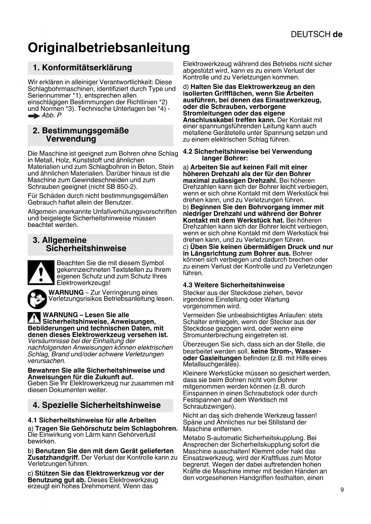 SBE 8502 - Bohrmaschine METABO - Kostenlose Bedienungsanleitung