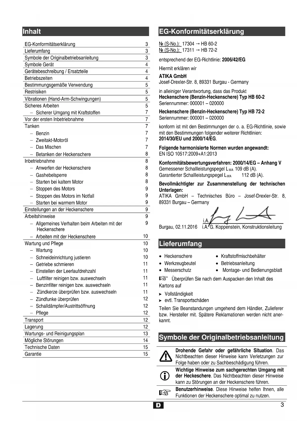 EG-Konformitätserklärung Nr. (S-No.): 17304 HB 60-2 Nr. (S-No.): 17311 HB 72-2 entsprechend der EG-Richtlinie: 2006/42/EG Hiermit erklären wir ATIKA GmbH Josef-Drexler-Str. 8, 89331 Burgau - Germany in alleiniger Verantwortung, dass das Produkt Heckenschere (Benzin-Heckenschere) Typ HB 60-2 Seriennummer: 000001 – 020000 Heckenschere (Benzin-Heckenschere) Typ HB 72-2 Seriennummer: 000001 – 020000 konform ist mit den Bestimmungen der o. a. EG-Richtlinie, sowie mit den Bestimmungen folgender weiterer Richtlinien: 2014/30/EU und 2000/14/EG. Folgende harmonisierte Normen wurden angewandt: